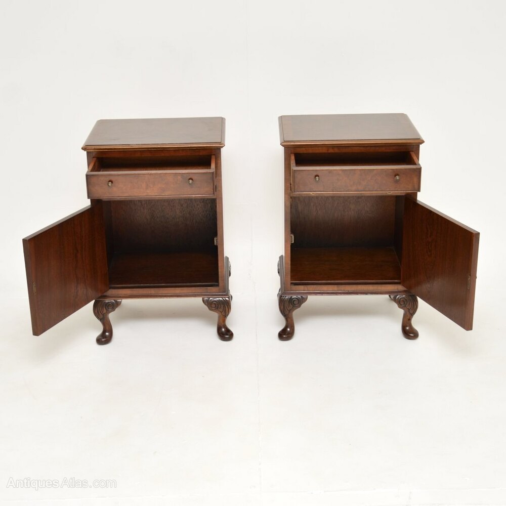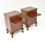 The quality is superb, they are beautifully designed and are a useful size. The doors and tops have cross banded edges, there are high quality brass handles on the doors and drawers. Each has a useful pull out slide shelf that comes out from between the door and drawer, they stand on short cabriole legs with acanthus leaf carving at the knees.
