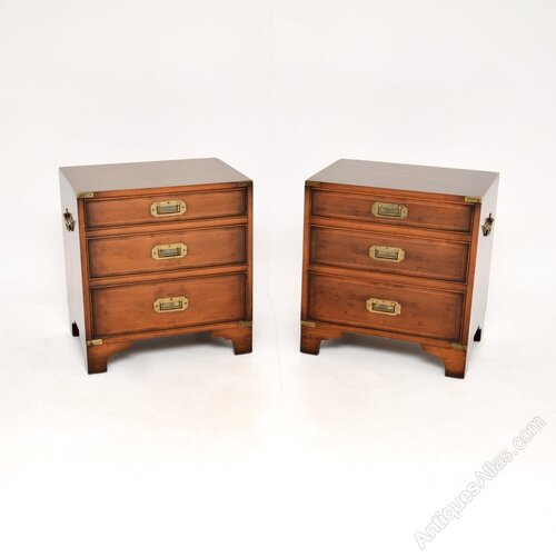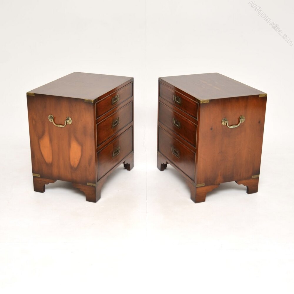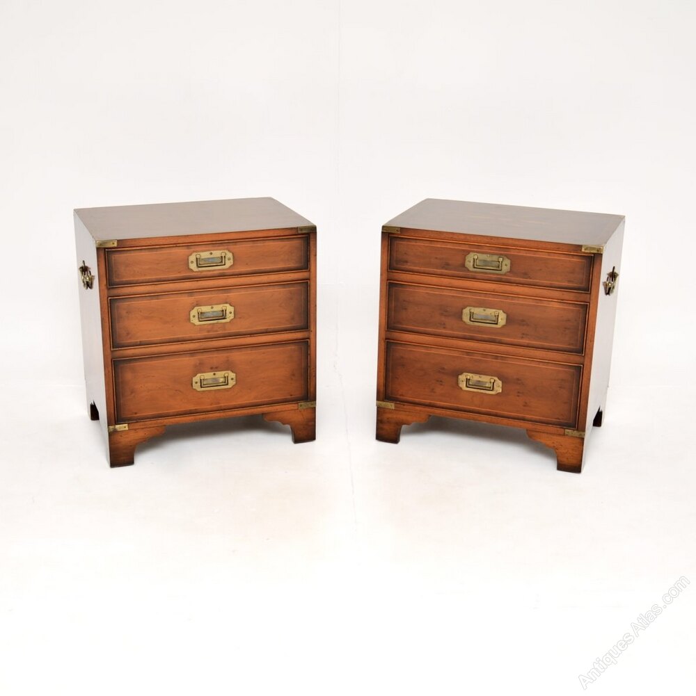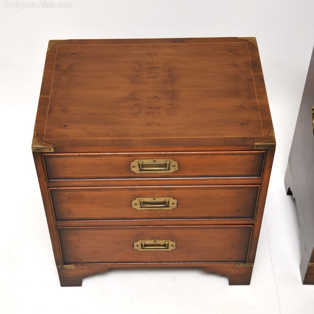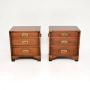 A wonderful pair of antique military campaign style yew wood bedside chests. They were made in England, and date from around the 1930’s.