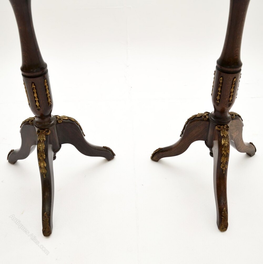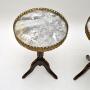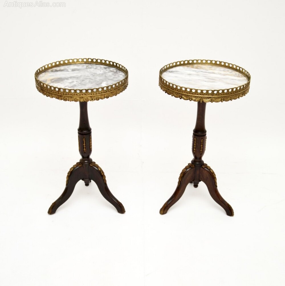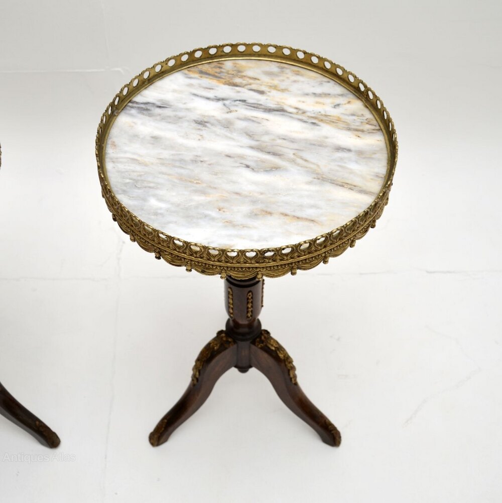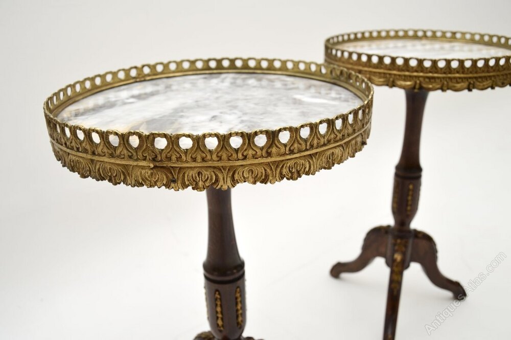 The quality is outstanding and they are a very useful size. The marble tops have gorgeous colours and patterns, they are held in place by high quality gilt metal pierced galleries. There are subtle differences between the decorations on the pierced galleries, otherwise the tables are identical. The solid tripod legs are beautifully crafted and also have high quality gilt metal mounts.