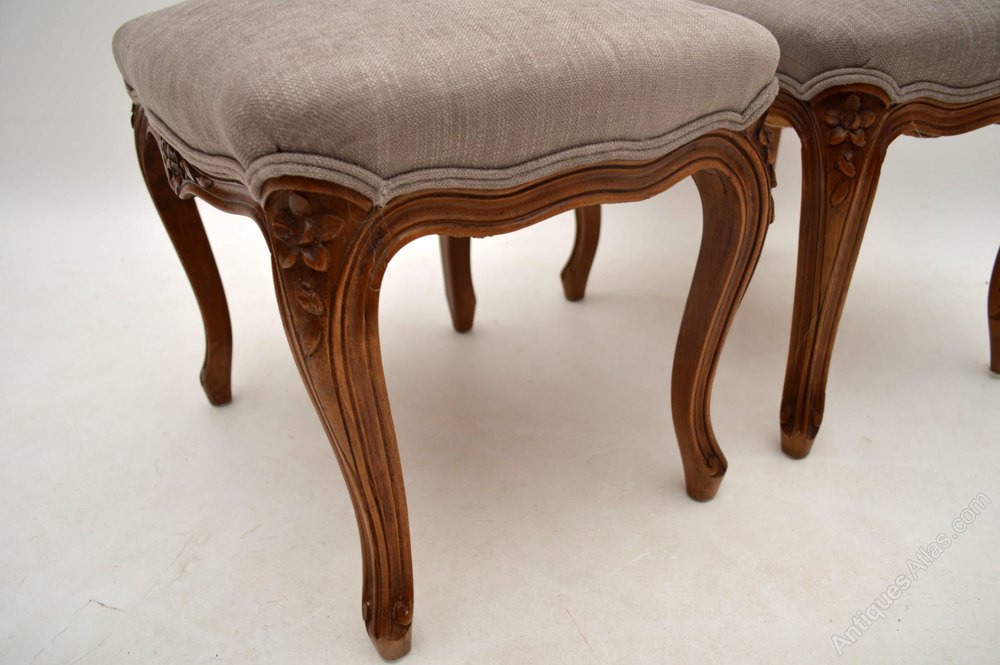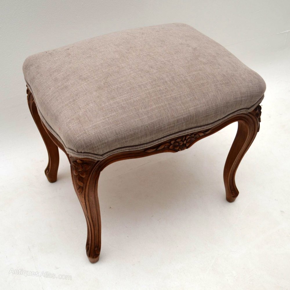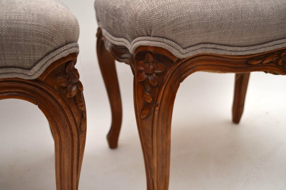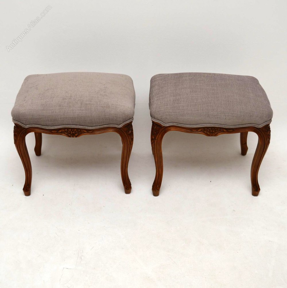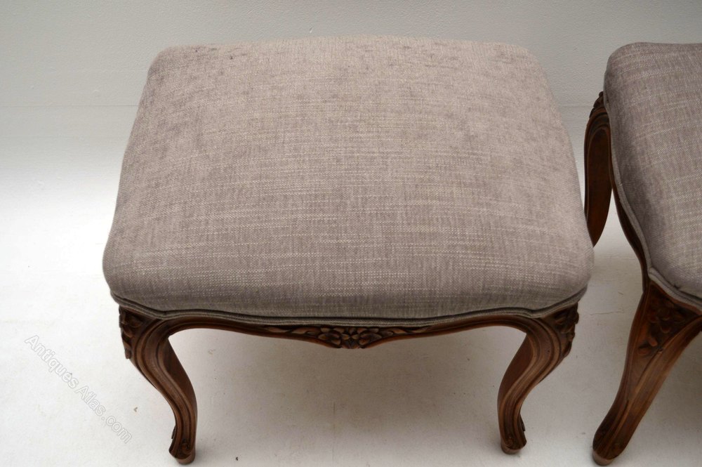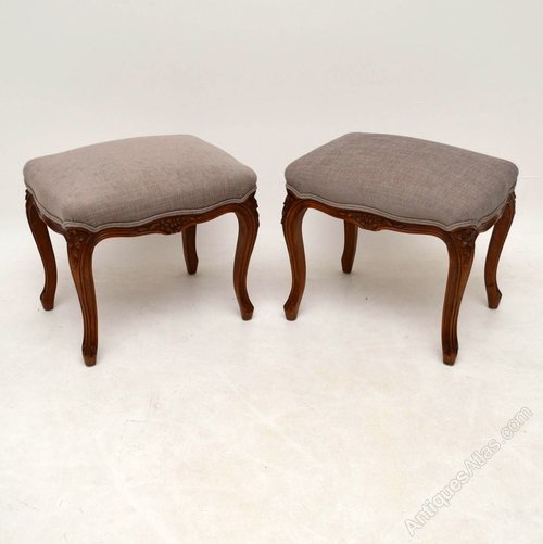Pair of antique French upholstered stools in great condition & dating from around the 1910-20's period. They have nicely shaped frames & legs with fine carvings. These stools have just been polished & re-upholstered in a grey coloured fabric with double piping.