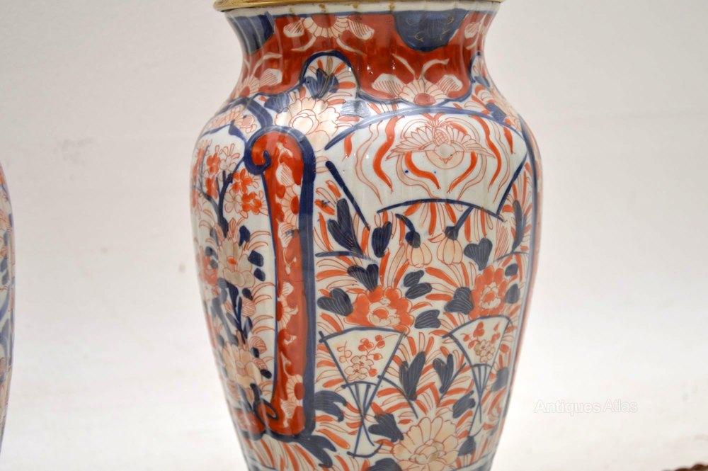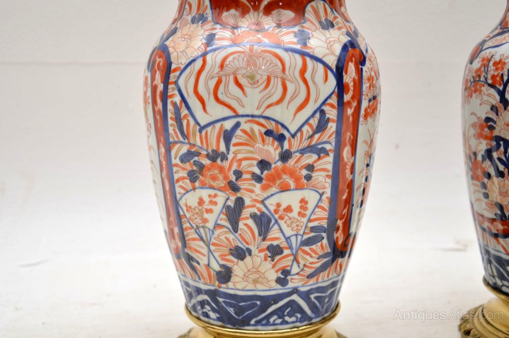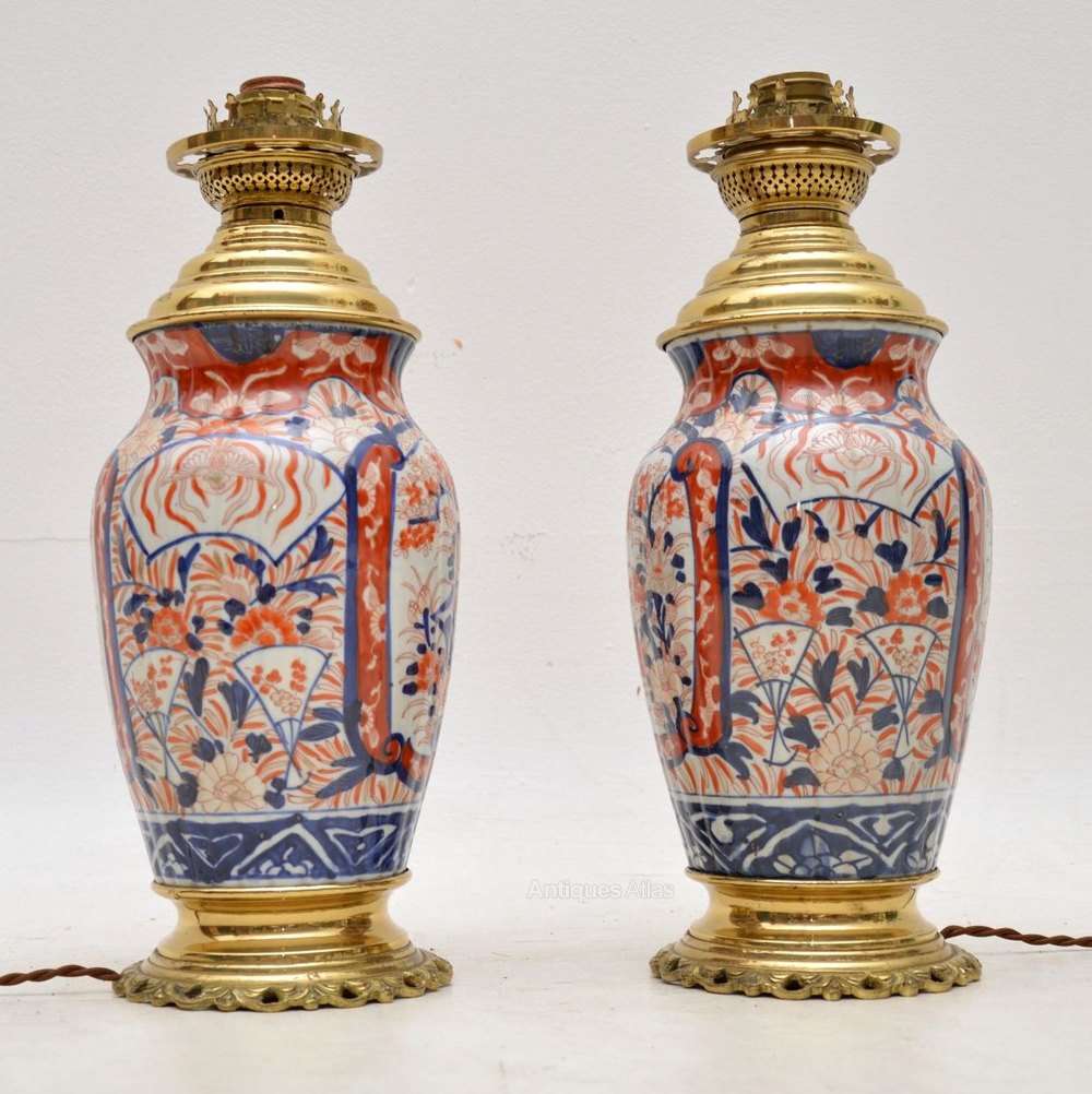 Pair of antique Imari table lamps in excellent condition. I obtained this pair from a private London residence & they look like they may have been originally oil lamps. The brass fittings are very good quality & the lamps are electrified. I would date them to around the 1890-1900 period & they are either Chinese or Japanese.