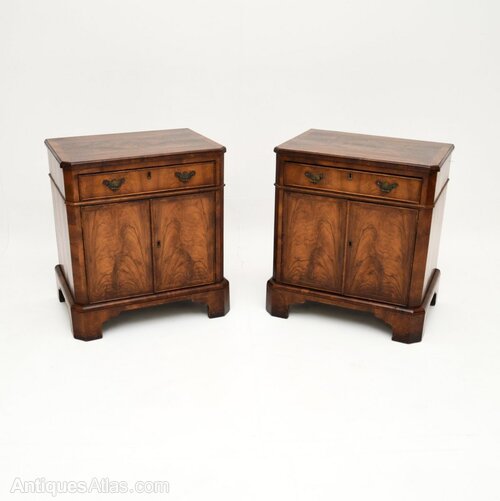 The quality is amazing, they have a great look and are a very useful size. The tops and door fronts are cross banded with double herringbone inlaid borders, the walnut has stunning grain patterns and colour tones. They have beautifully moulded edges and stand on bracket feet, the drawers have high quality brass handles and fine, hand cut dovetailed joints. The construction is very solid, they are very strong and sturdy.