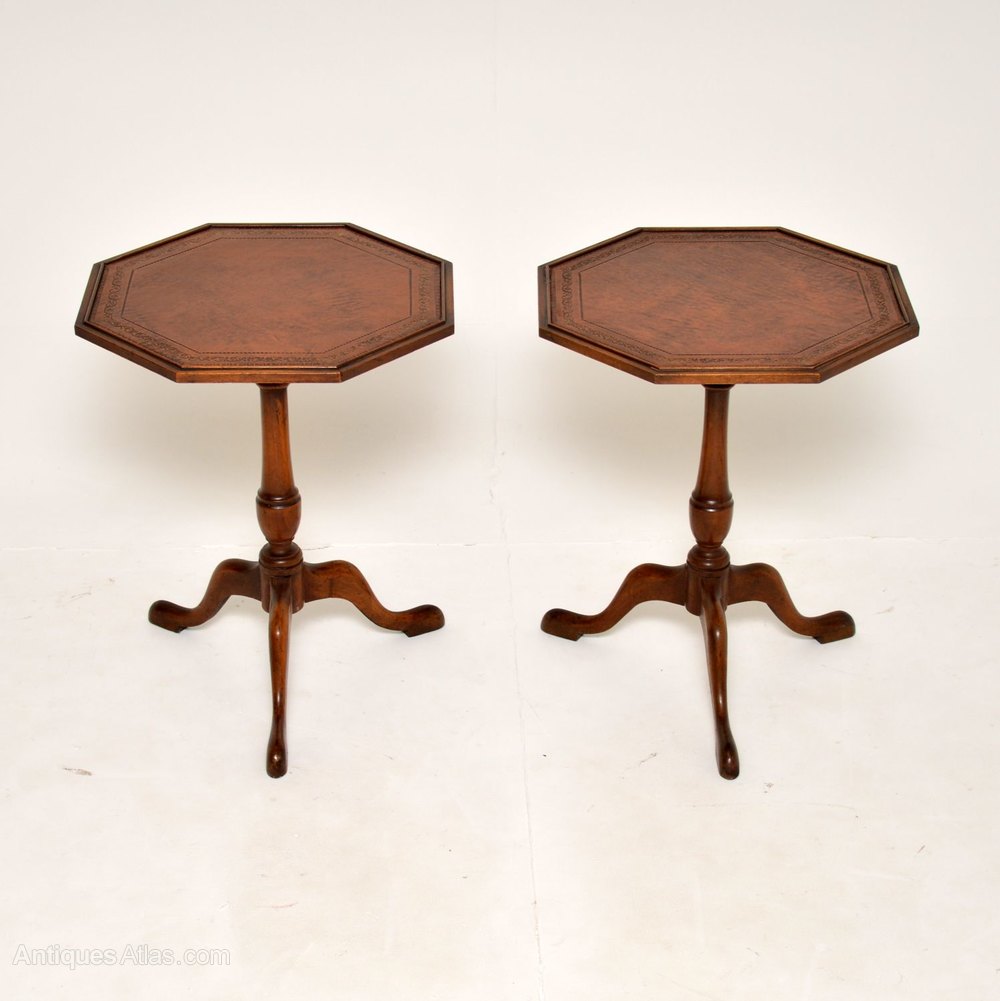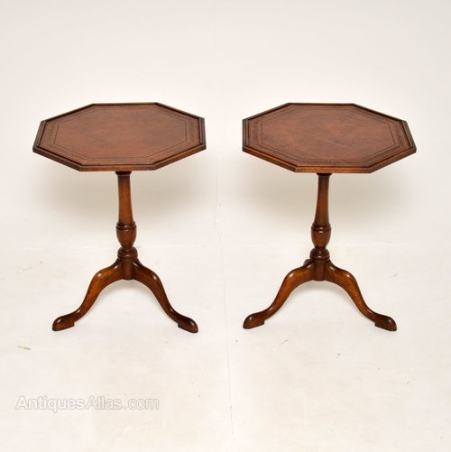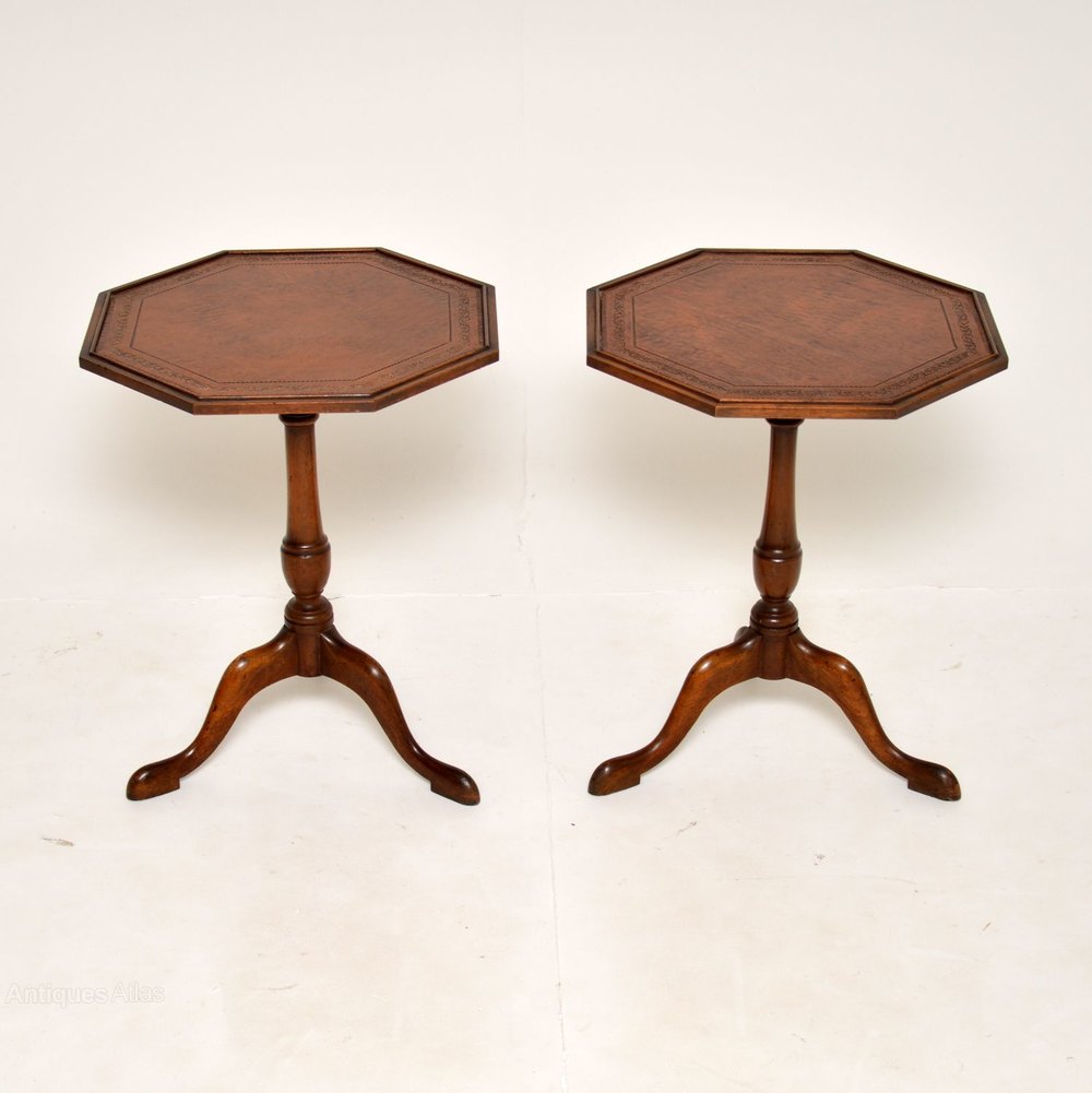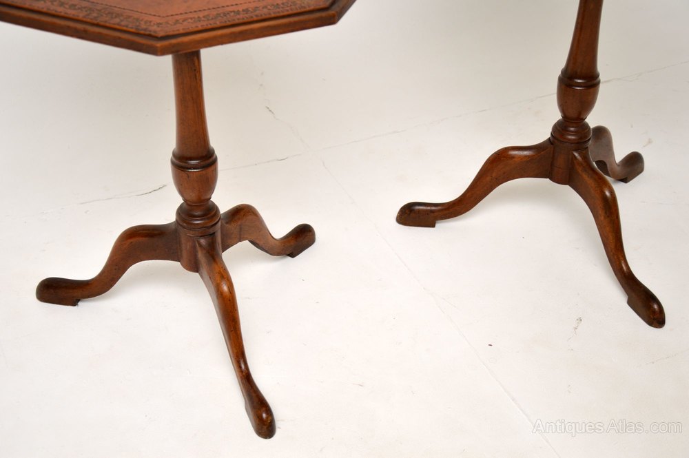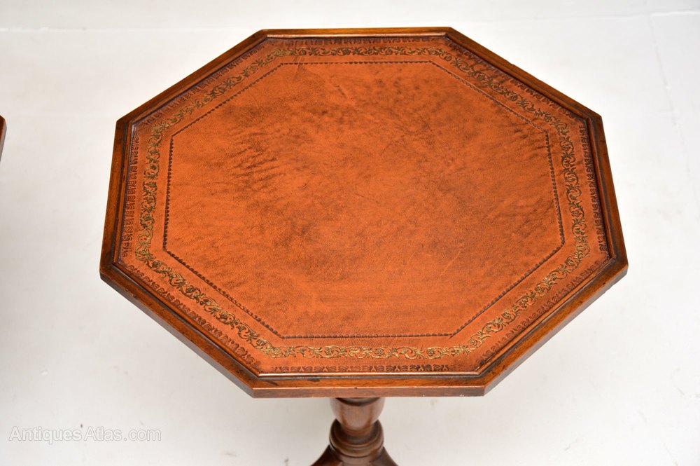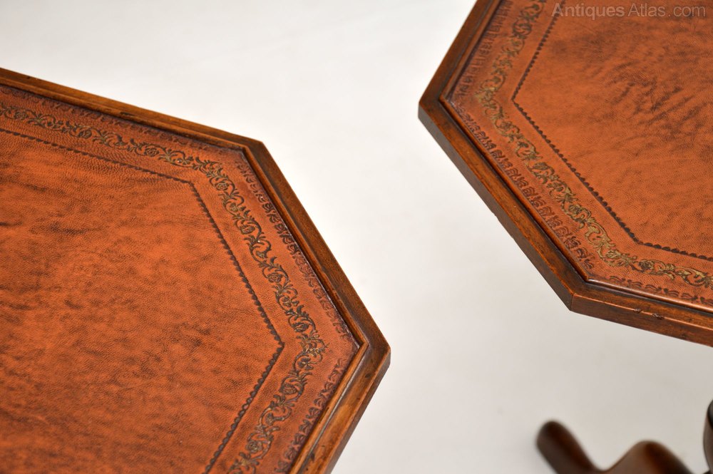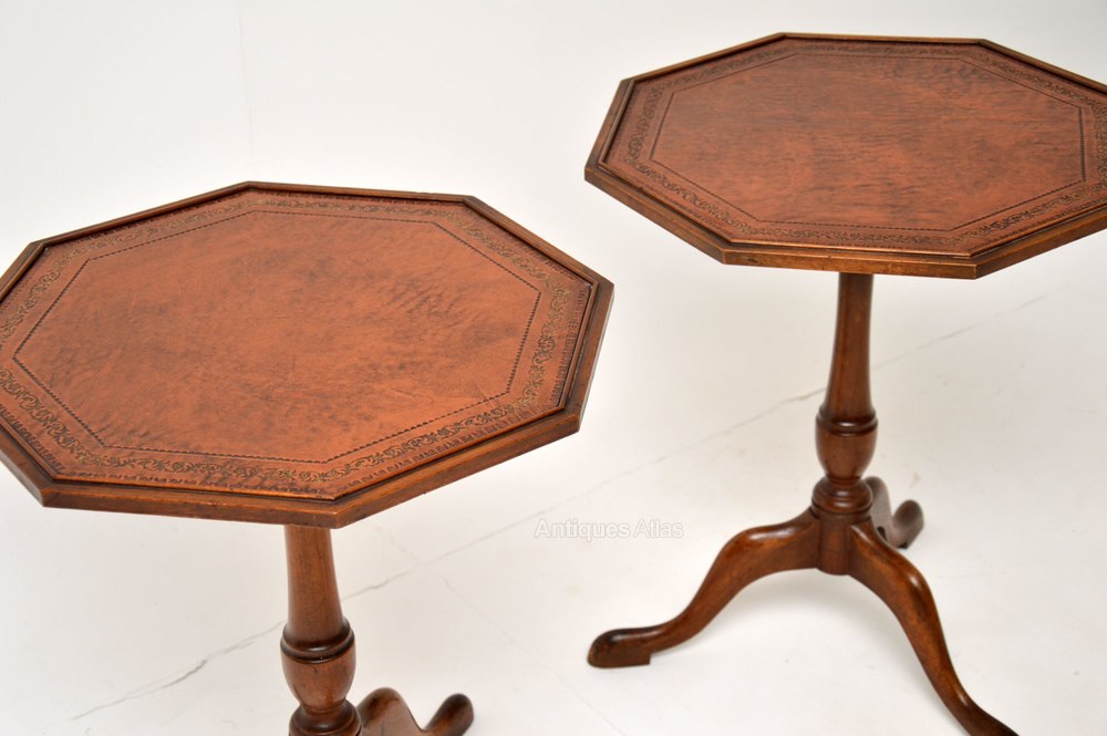 A smart and very well made pair of octagonal mahogany side antique tables with leather tops. They were made in England, and date from around the 1930’s.