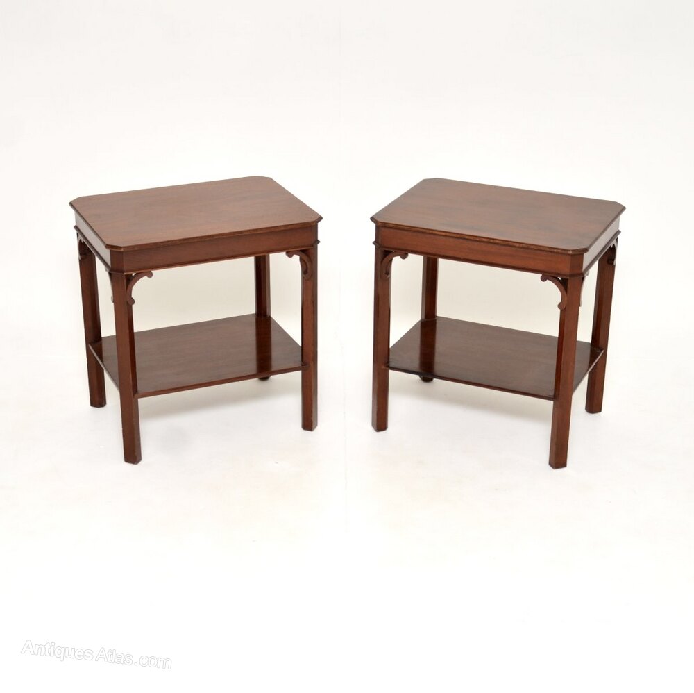 The quality is excellent and they are a very useful size to be used as lamp antique tables. The rectangular tops have canted corners and slightly raised edges, there is a useful lower tier on each table. They are nicely finished on all sides, so can be used as free standing items.