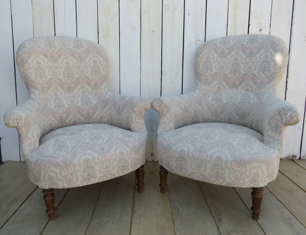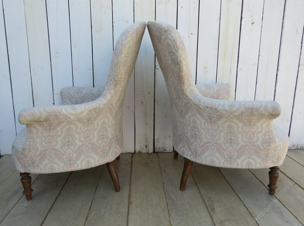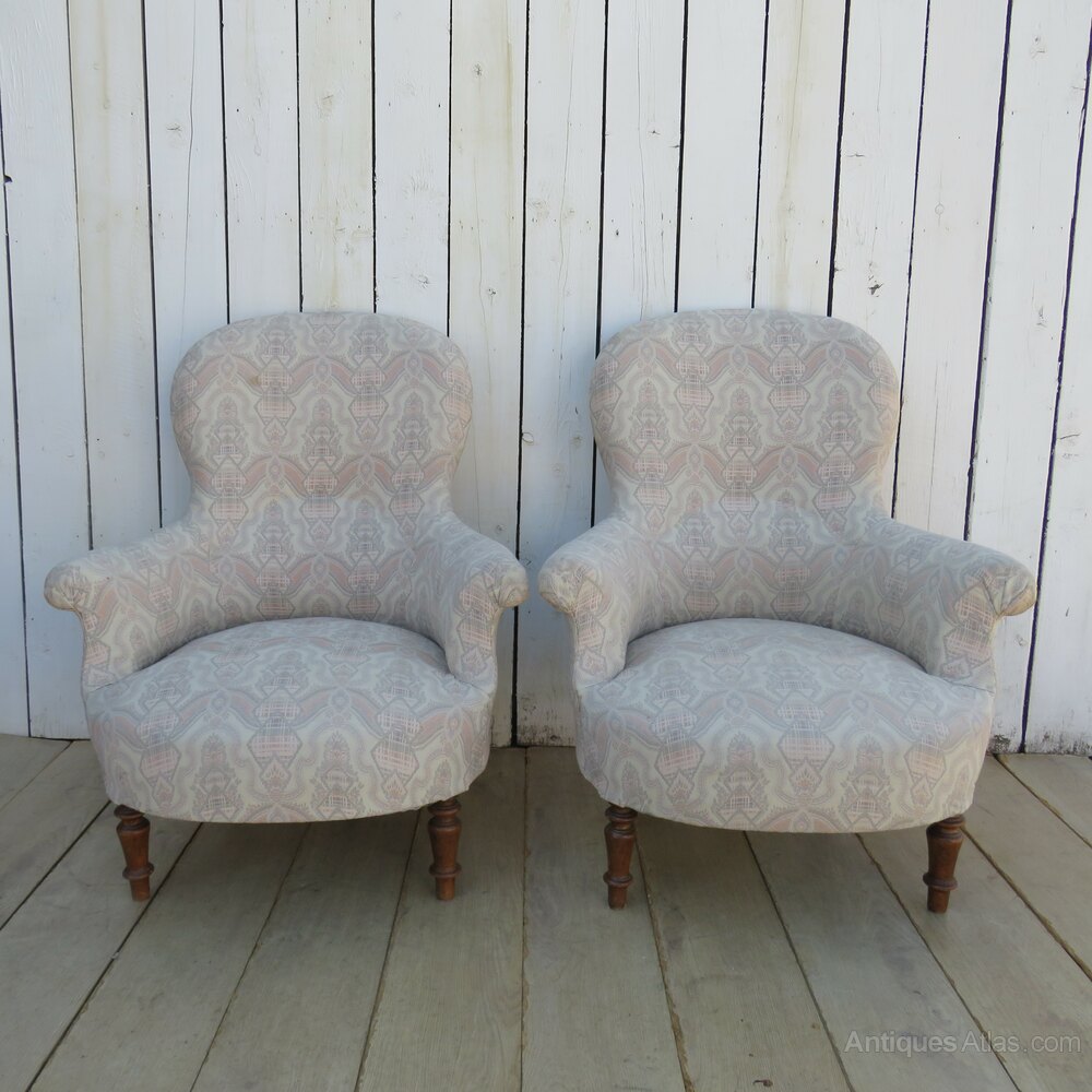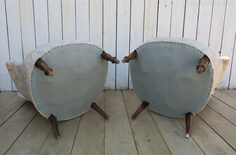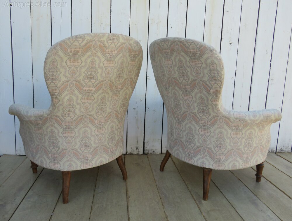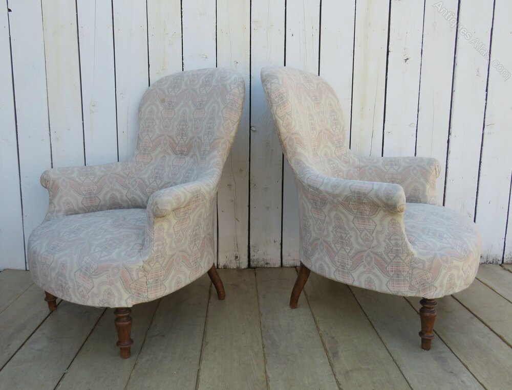 Shapely pair of sound and sturdy 19th century French balloon back Napoleon III crapaud tub armchairs on oak legs for re-upholstery.