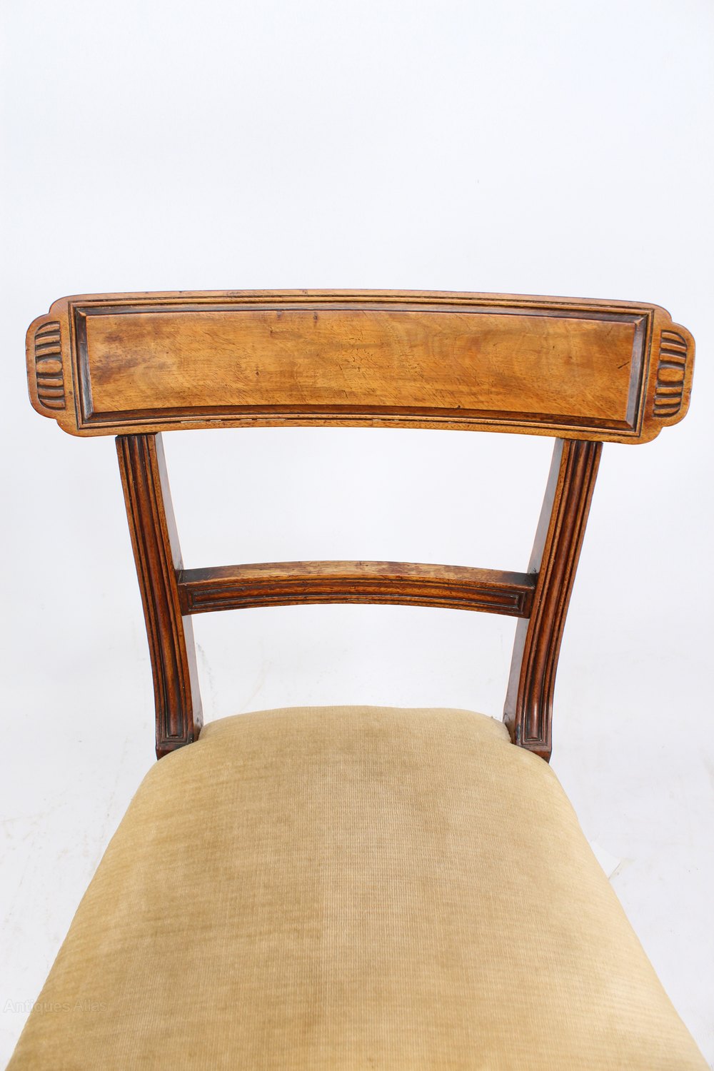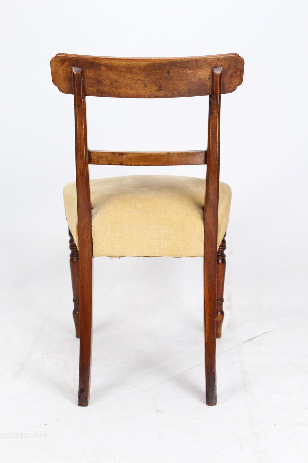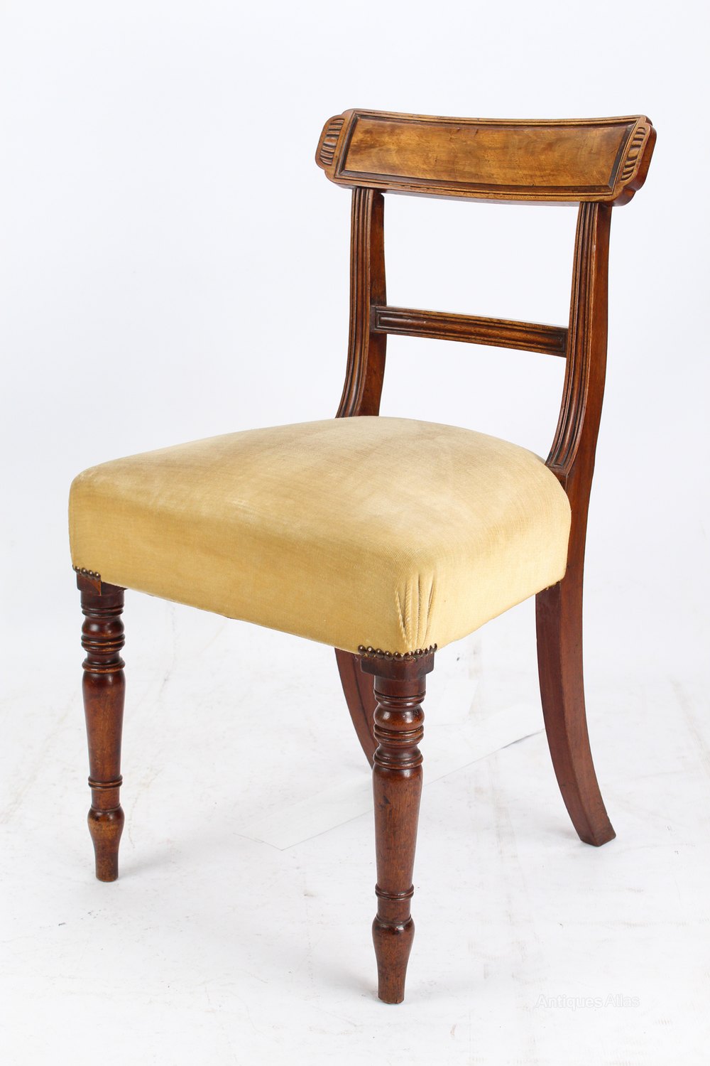 A good quality pair of antique Regency mahogany chairs dating from circa 1820. They have oblong top rails above reeded centre rails and stand on turned legs to the front and sabre legs to the back. The stuff-over seats are upholstered in a faded gold fabric.