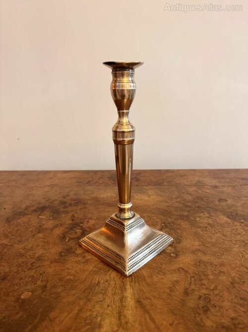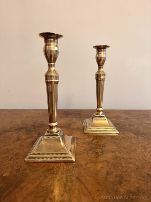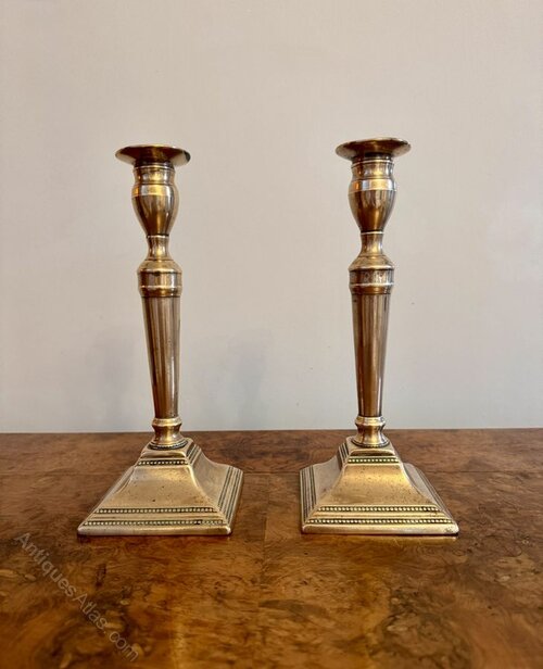 Elegant quality pair of antique Victorian brass candlesticks having a quality pair of antique brass candlesticks with turned columns raised on a stepped square brass base with beaded detail.