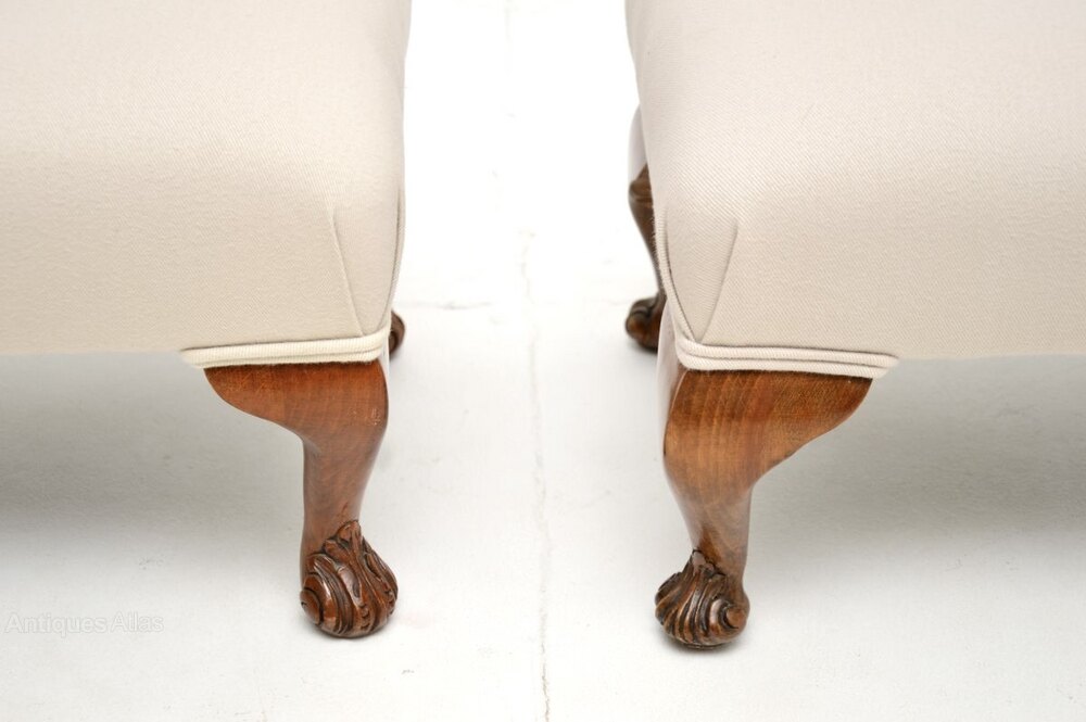 The quality is superb, the solid walnut frames have beautiful cabriole shaped legs with acanthus leaf carving at the feet. They are a slightly matched pair, with an almost undiscernible difference in size.