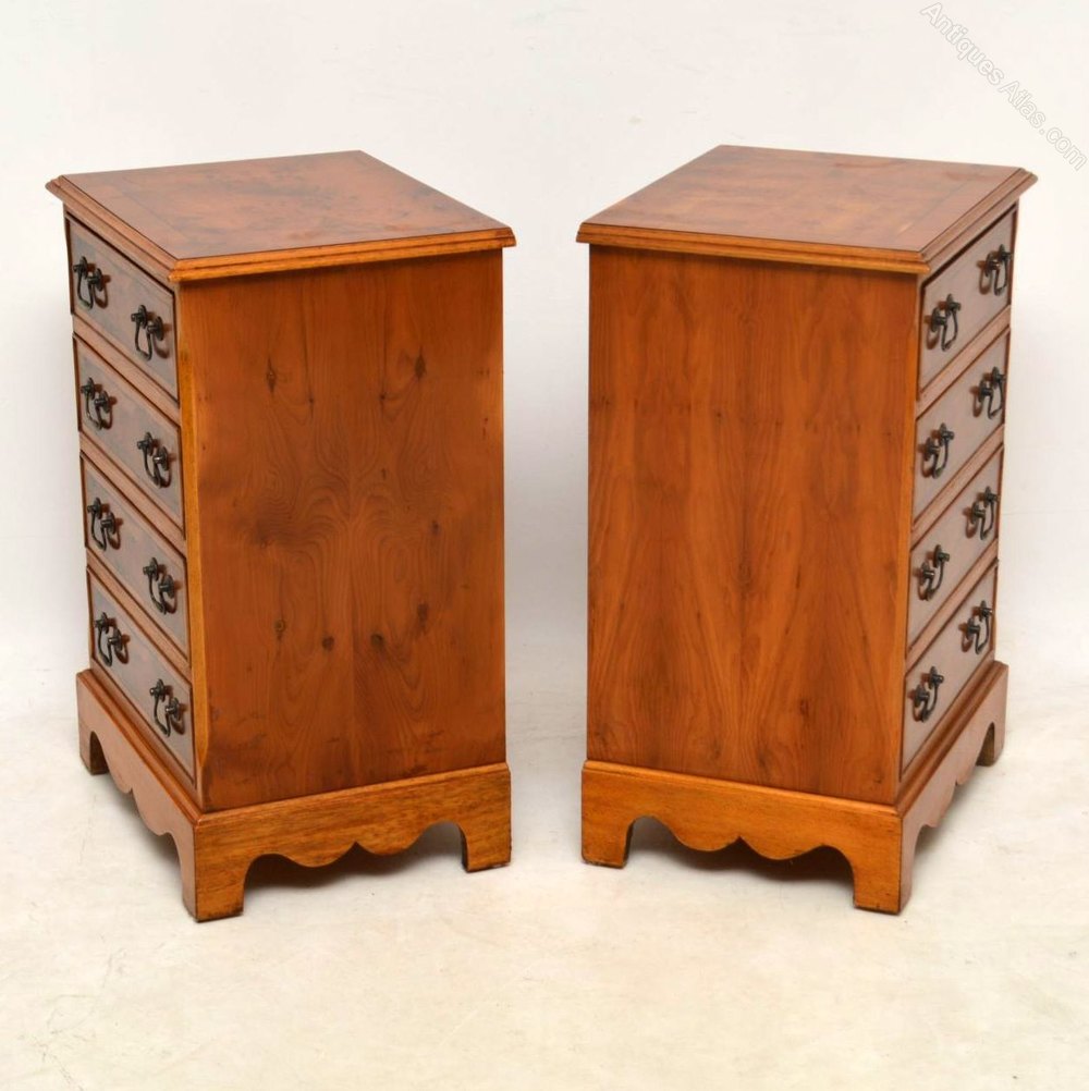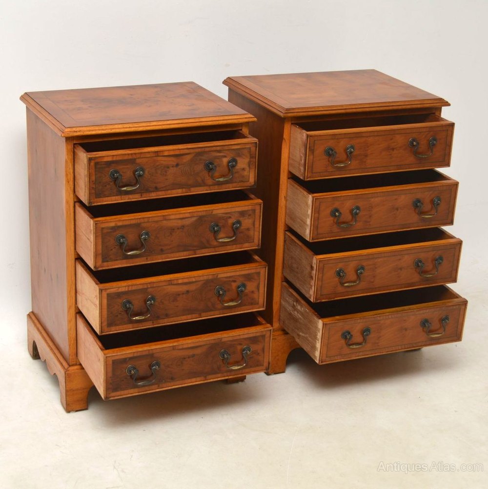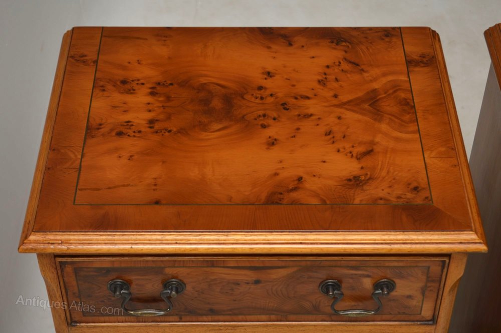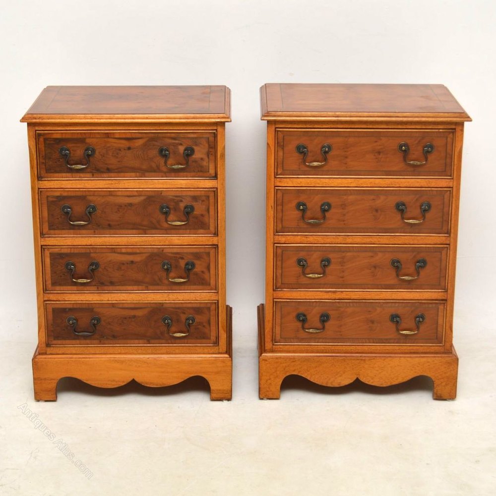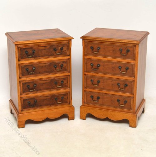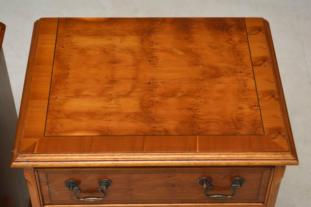 Pair of antique Georgian style bedside chests in yew wood with cross banded tops & drawers, sitting on shaped bracket feet. They are in excellent condition having just been polished & I would date them to around the 1950's period. There are four drawers on each chest which have original brass handles. You will notice that there is a bit of difference in the pattern of the woods on each chest. Basically, the veneers on one are more dense. However they are a pair & that's the beauty of natural wood.
