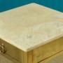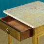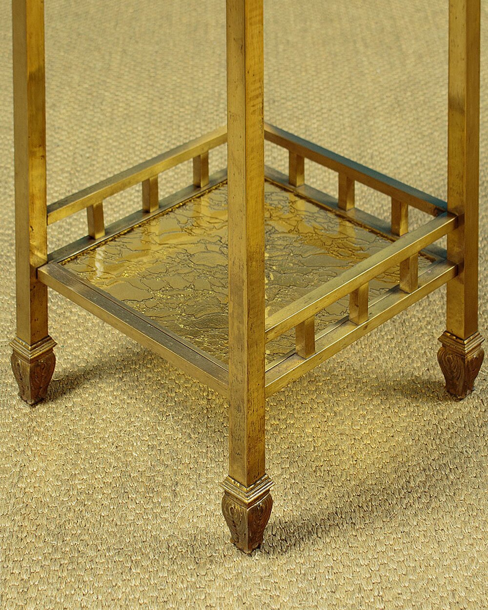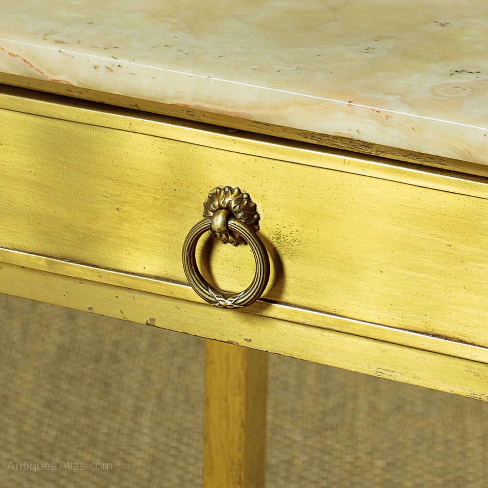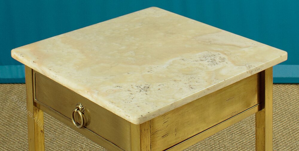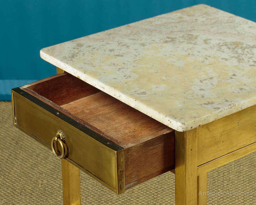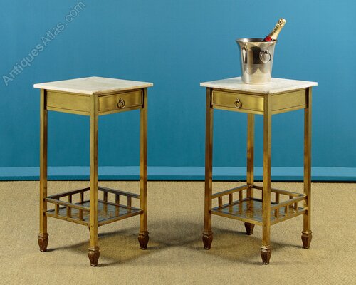 Unusual pair of Art Deco era brass and marble top side antique tables c.1930. Ideal as bedsides or as lamp tables in a living room perhaps. Original pale marble tops with rounded corners. On brass bases, each with a small drawer and an open shelf with original amber glass shelf and a raised gallery to the sides and rear. Striking modernist design free of almost any applied decoration save for the ring handle and the acanthus detail to the feet front and rear. Nice quality with oak drawer linings and solid brass. Presented as found in very good condition. The lacquered finish has worn through in places but the brass could be polished bright again.