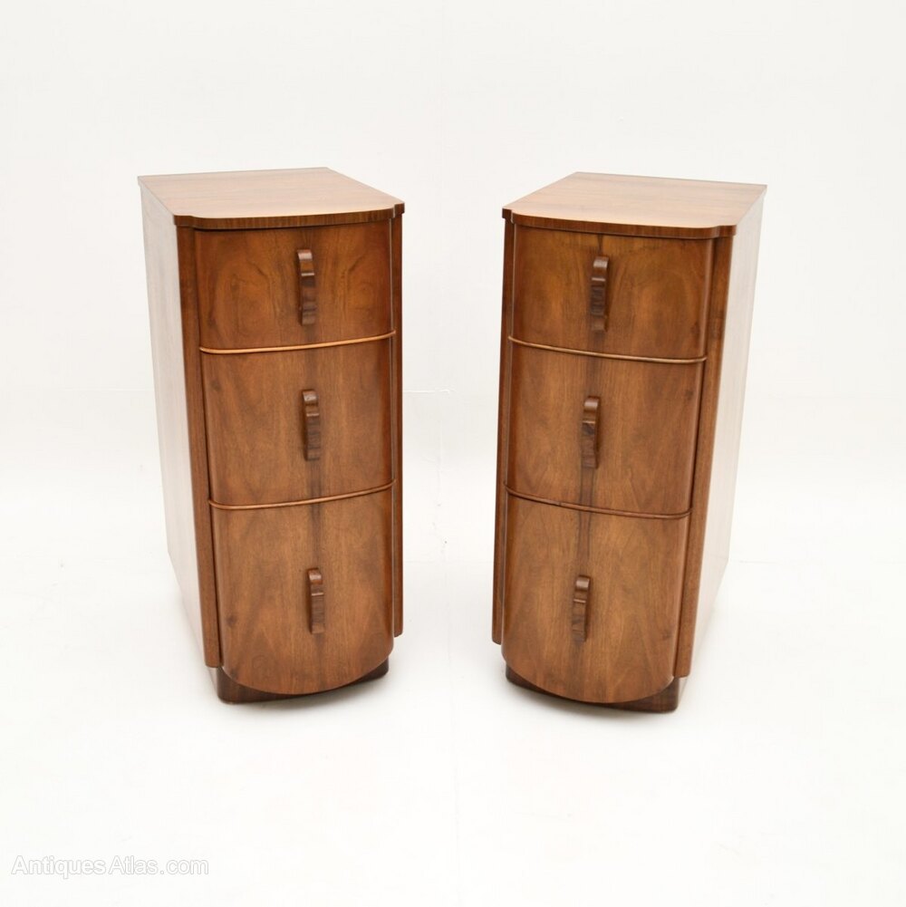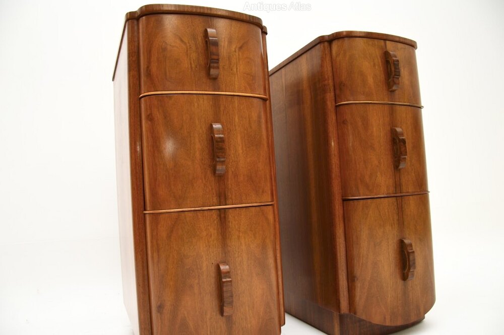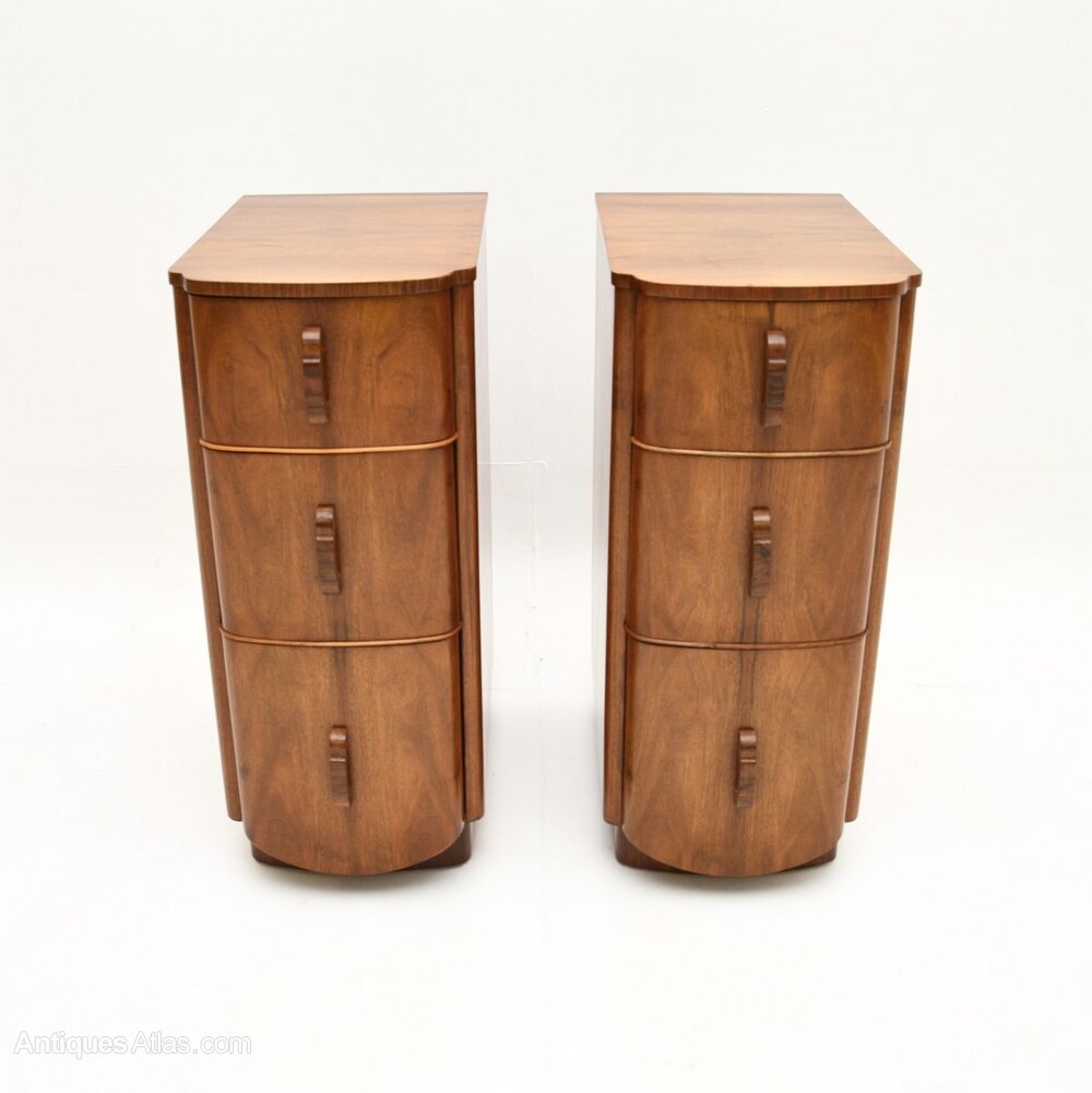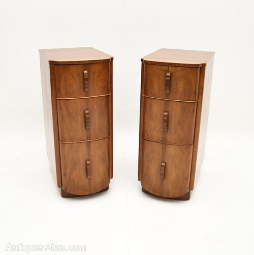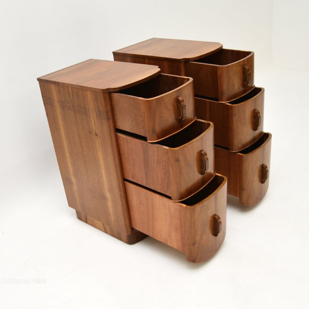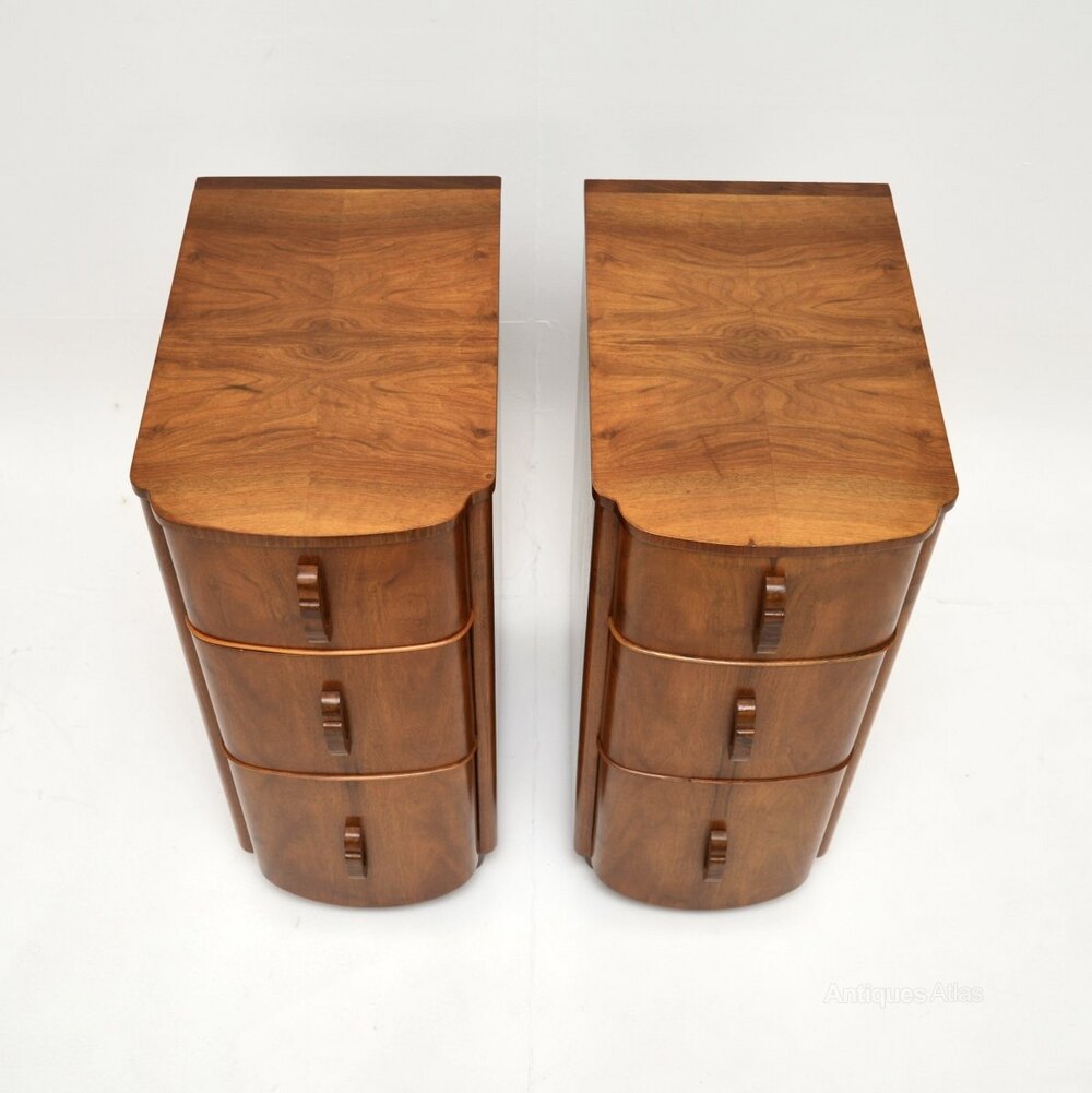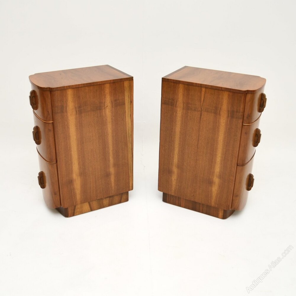 A stunning pair of Art Deco figured walnut bedside chests. They were made in England, they date from around the 1930’s.