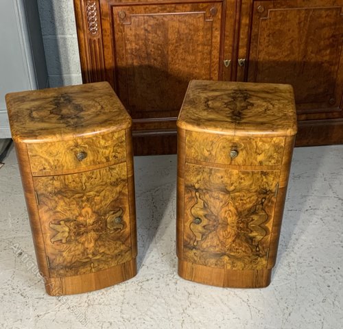 This lovely pair of Art Deco walnut bedside cabinets are offered in very good condition.