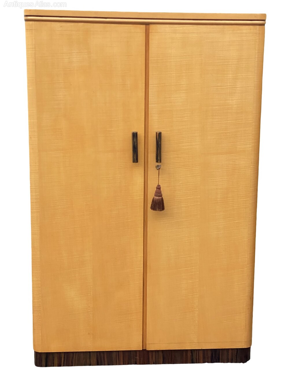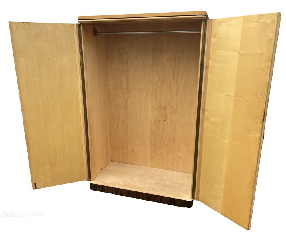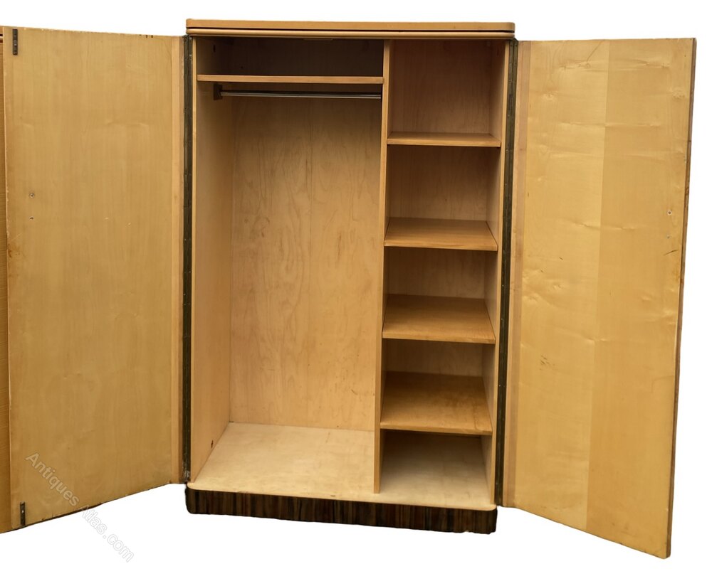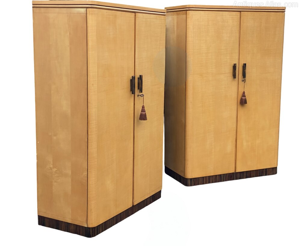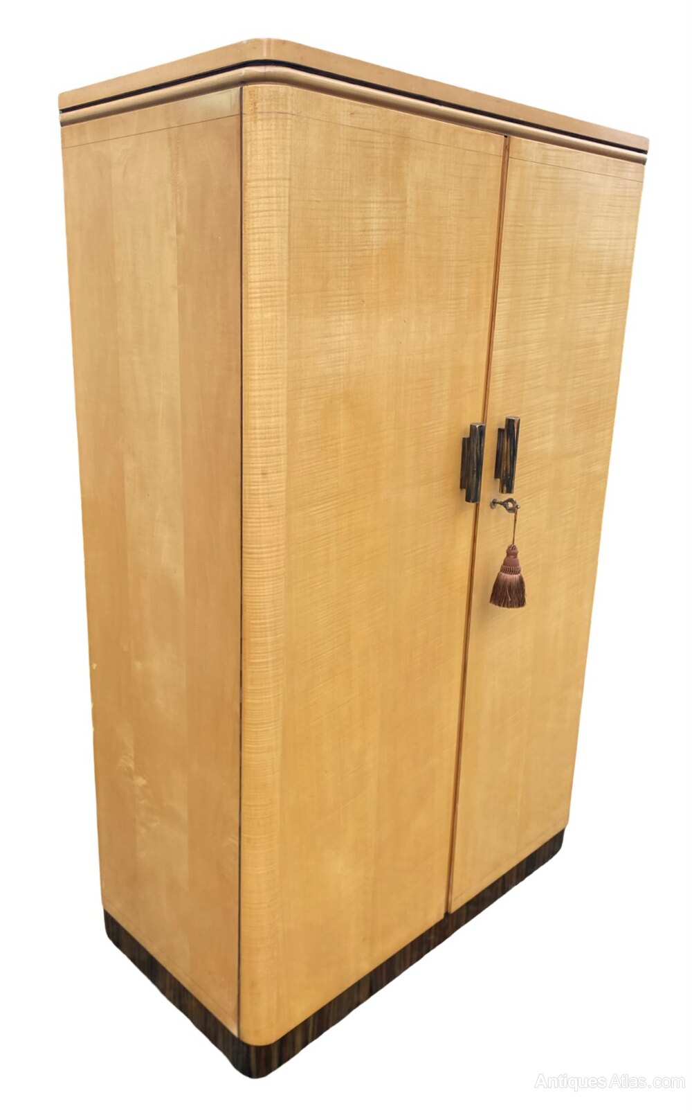 A glorious pair of matching Art Deco Wardrobes, dating to the 1930s, in a lovely warm blonde sycamore with the tiniest of line inlay to the tops of the doors and sides. Unbelievably hard to find as a matching pair, both being identical in height, width and depth, literally a matching pair. The added beauty of these particular wardrobes is that they completely flat pack and reassemble easily and firmly, each taking roughly 10 mins to assemble or disassemble and making them perfect for a difficult staircase or rooms where access is tricky. The first wardrobe consists of full hanging with a substantial chrome rail fitted, it should be noted that the internal depth is excellent for modern hangers with a depth of over 19”. The second wardrobe has half hanging with useful shelf above and 4 adjustable shelves to the left hand side. Raised on a striking Macassar plynth which is round shouldered they boast matching Macassar large cylindrical handles. Provided with original working locks and keys. Lined in a pale sycamore.
