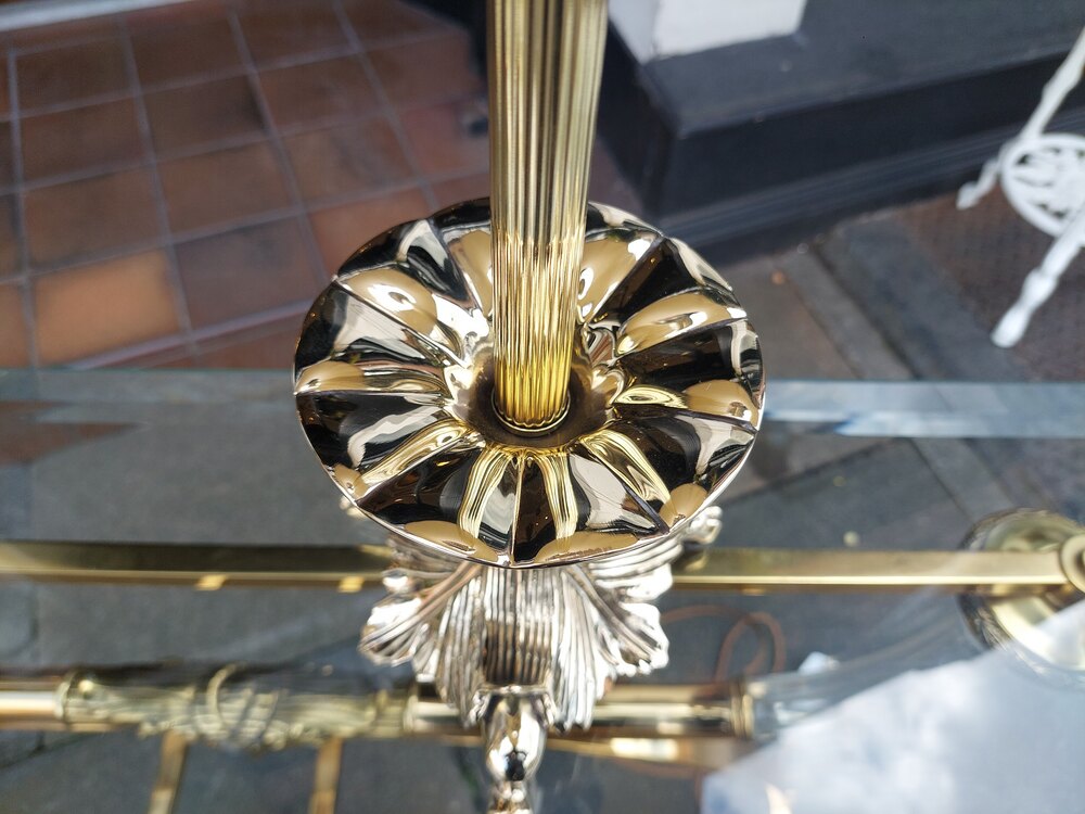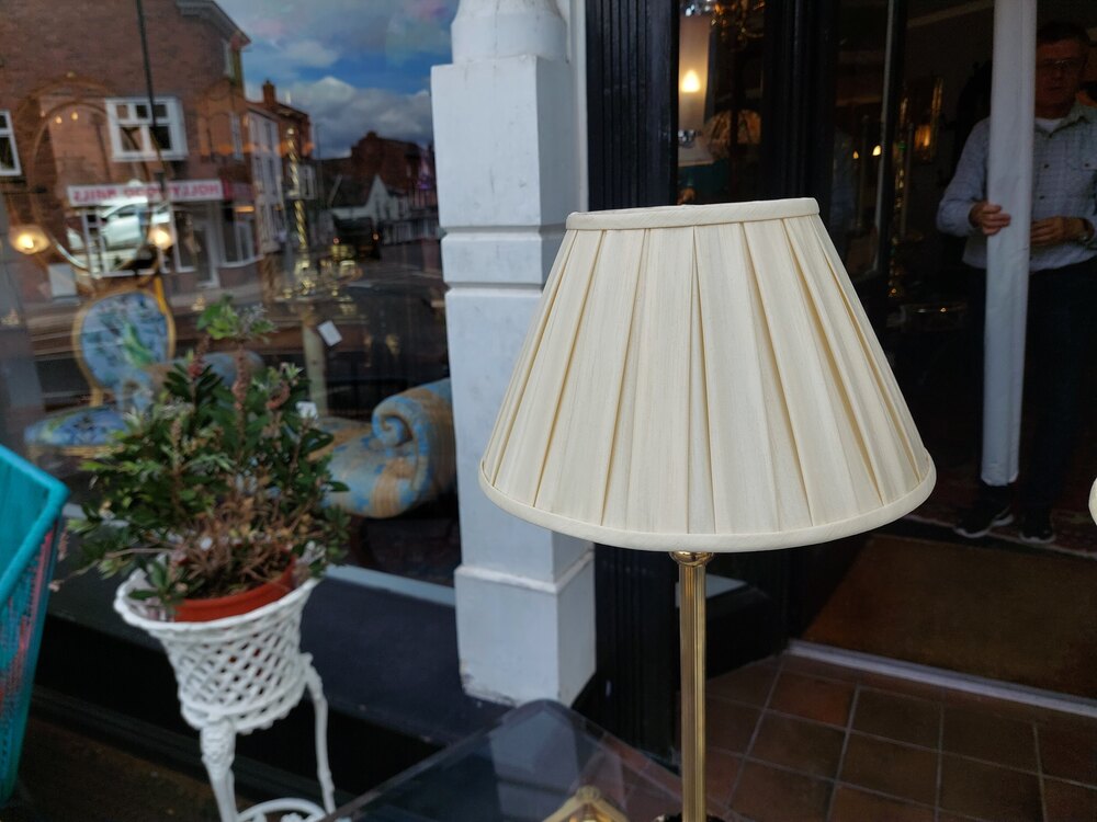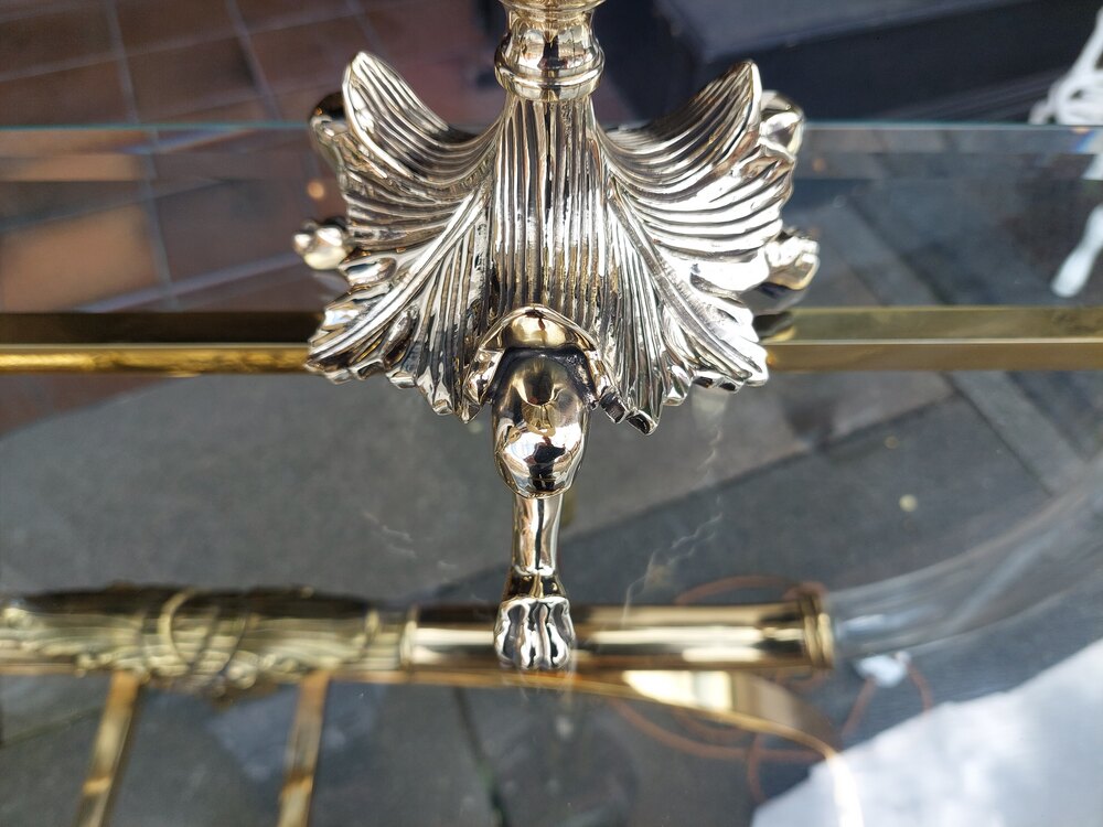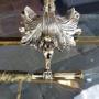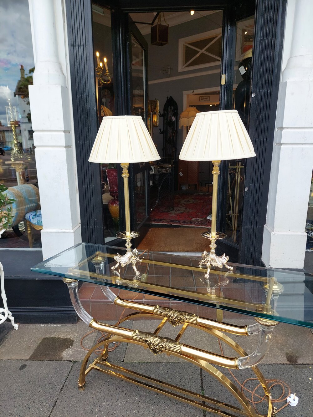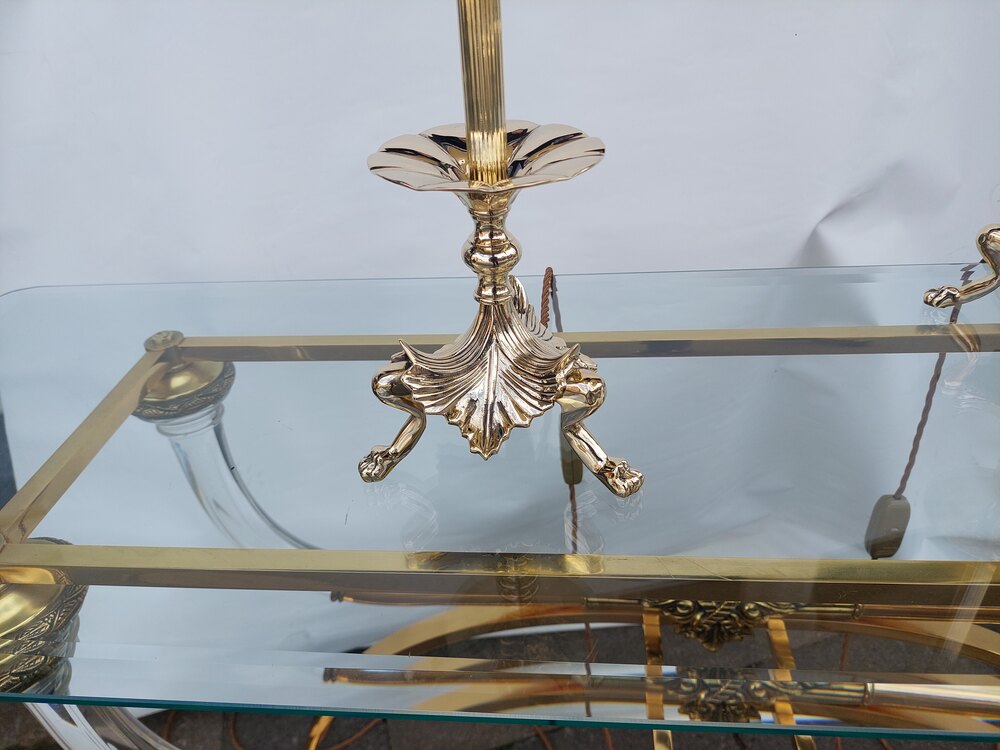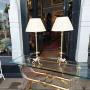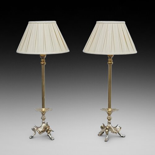 Pair of Art Nouveau Brass Table Lamps - with Tripod Bases on Anthemion Separated Lion Paw Feet - 27"h x 12"d - all lights and lamps have been rewired with authentic corded flex, fitted with either foot switch or finger clicker switch and are Pat tested