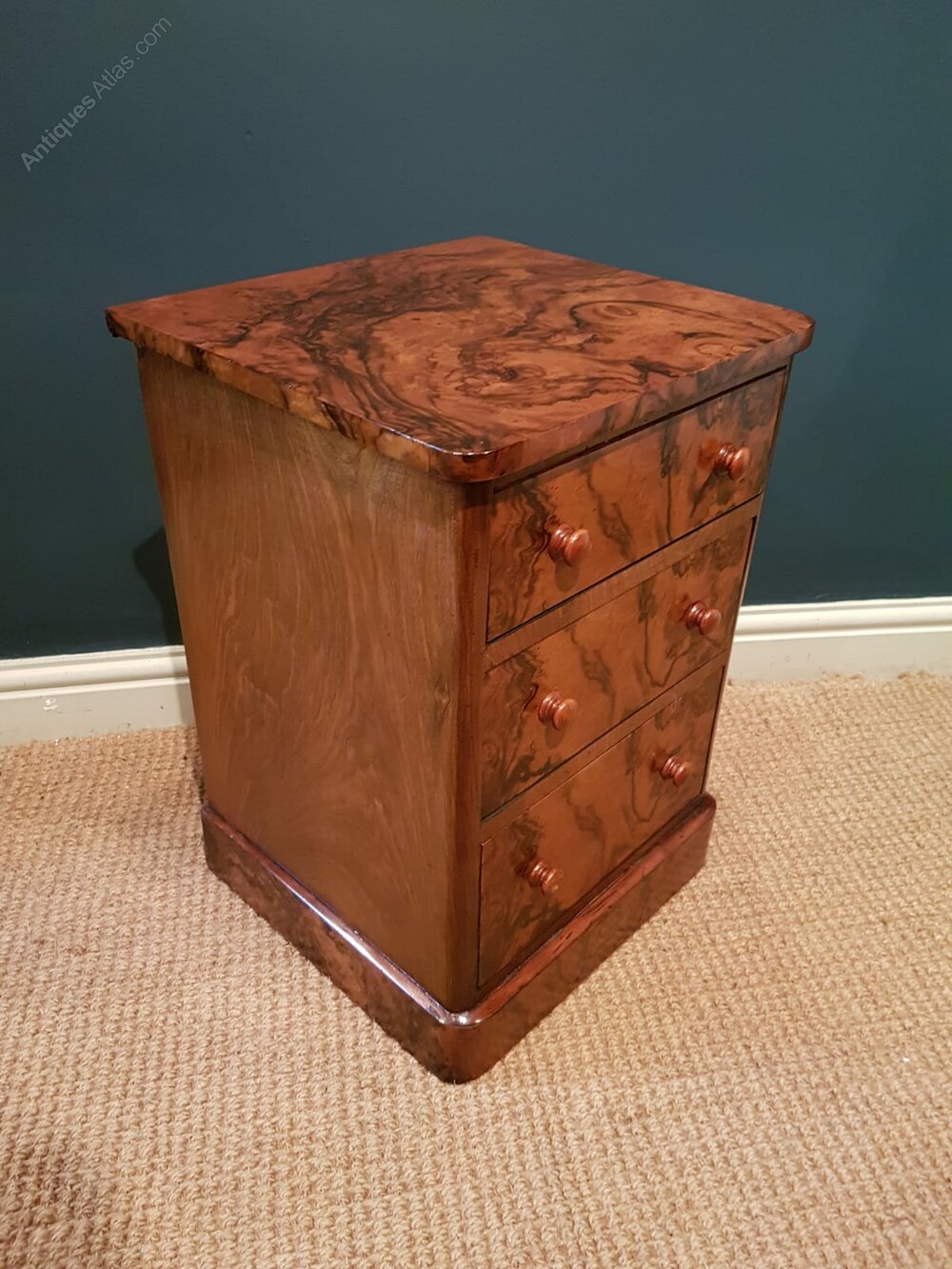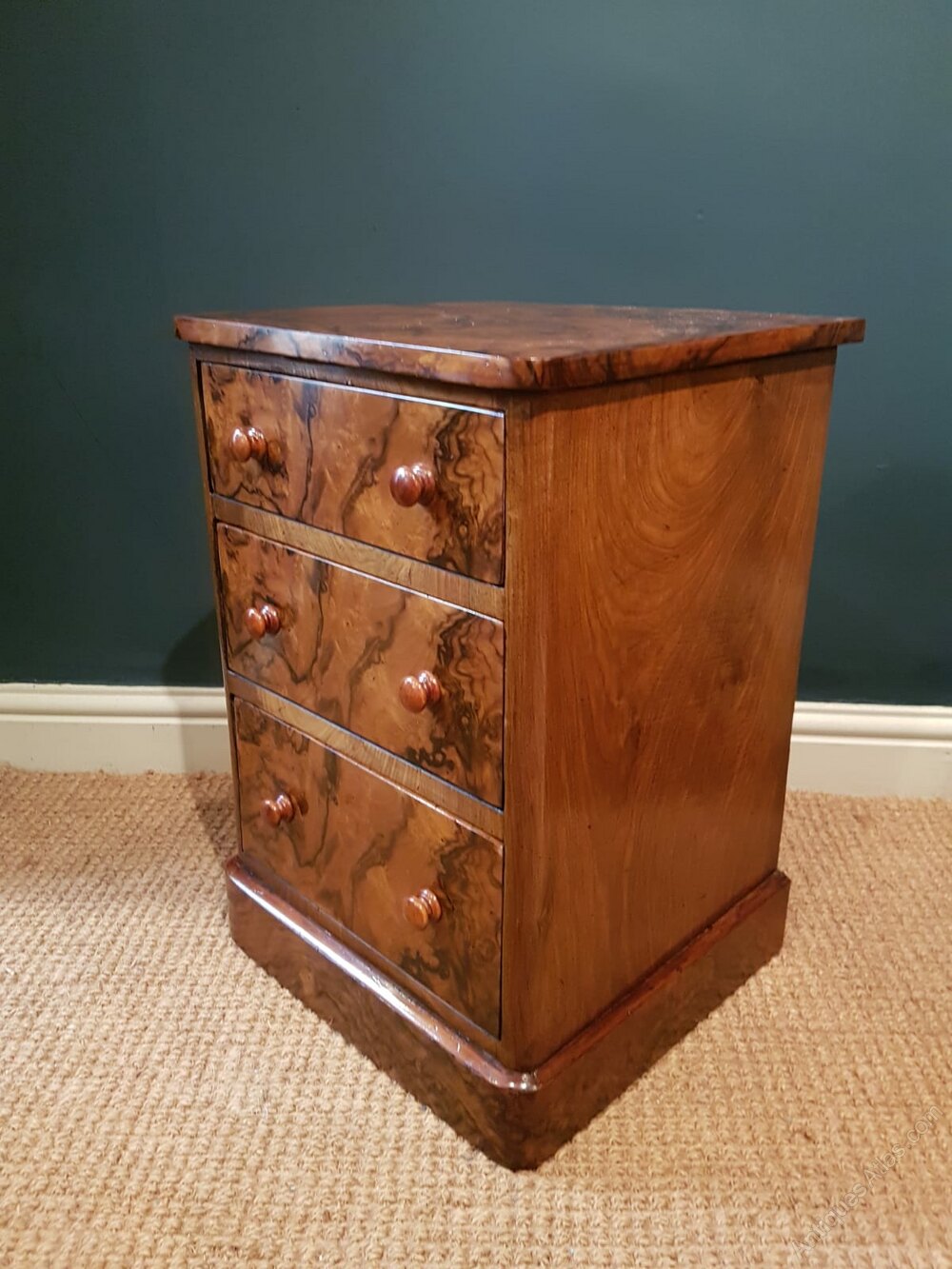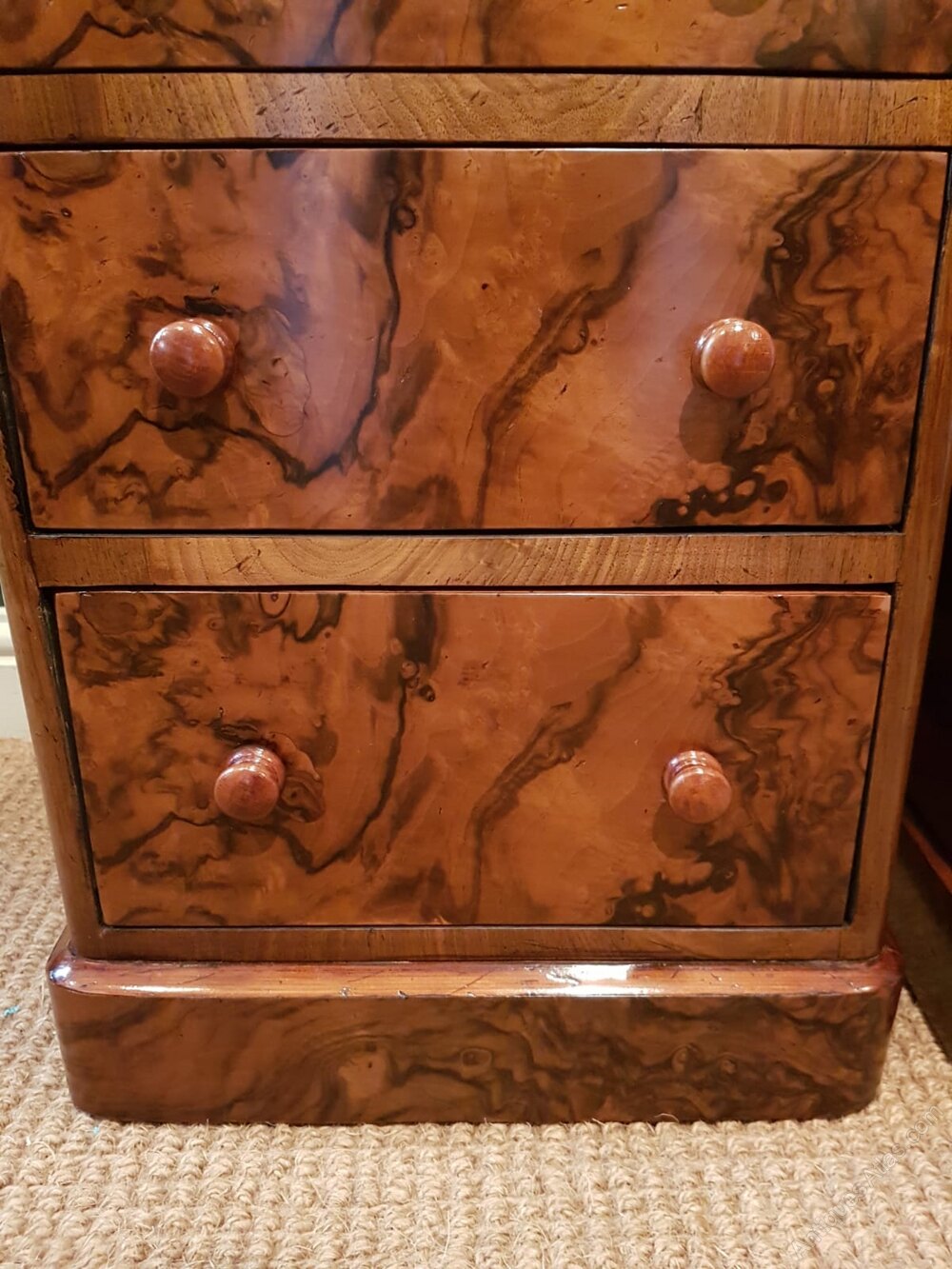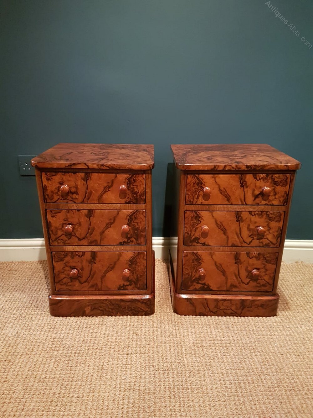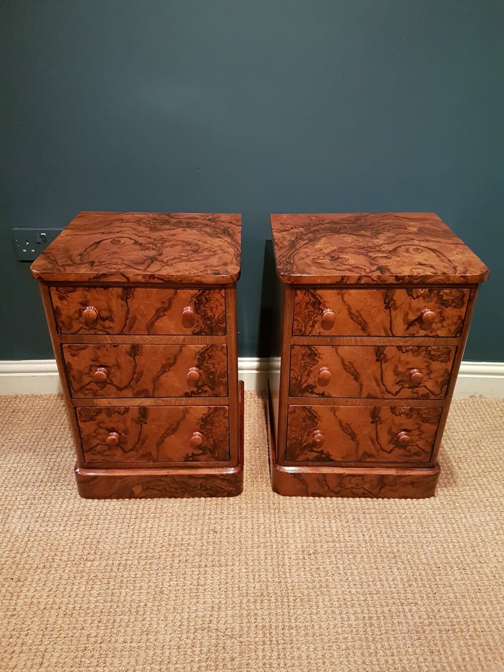 A matching pair of Victorian figured walnut book matched veneered three drawer bedside chests c.1880. Figured veneer tops to each with rounded corners sat over three graduated drawers with matching figured veneers, each chest mirroring the other. Rounded corners, original turned solid walnut knobs and apron foot to each. Each presented in excellent condition with a rich colour and deep polish. Each measures 16" wide x 14.75" deep x 23" high.