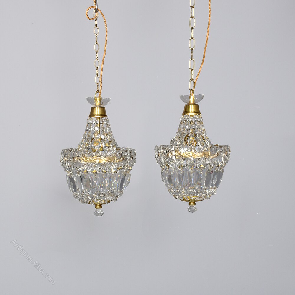 Circa 1930s. A stylish pair of neat sized brass and crystal light fittings,