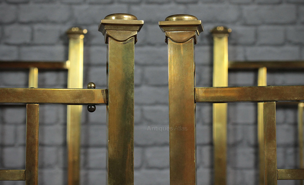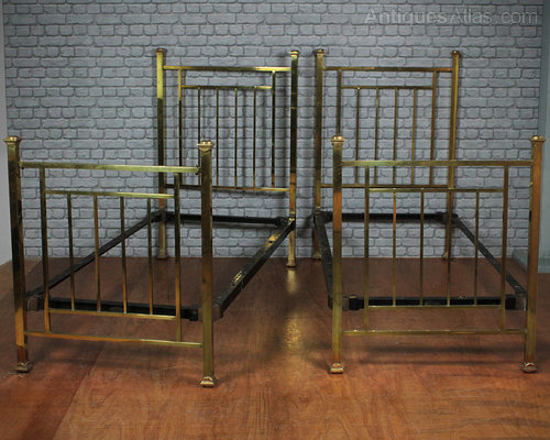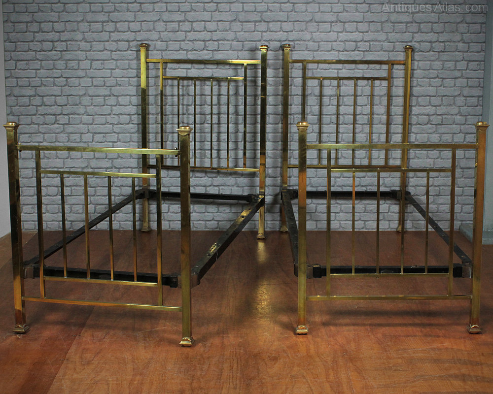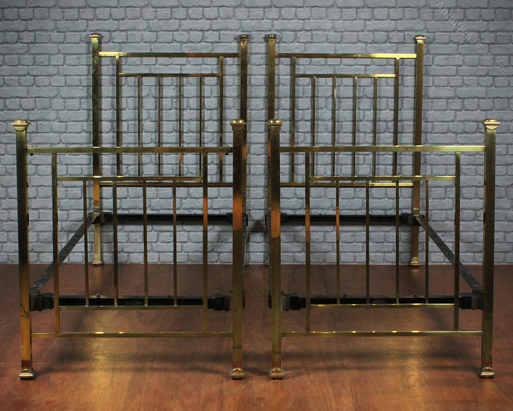 Lovely quality pair of Edwardian brass single beds by the celebrated London retailer Heal & Son of Tottenham Court Rd, London c.1905. Heavy brass head and foot in square section tube with shaped detail to the terminals. Sold with the original side irons ready to take a divan base and standard single mattress. Excellent condition with original Heal’s labels to each.