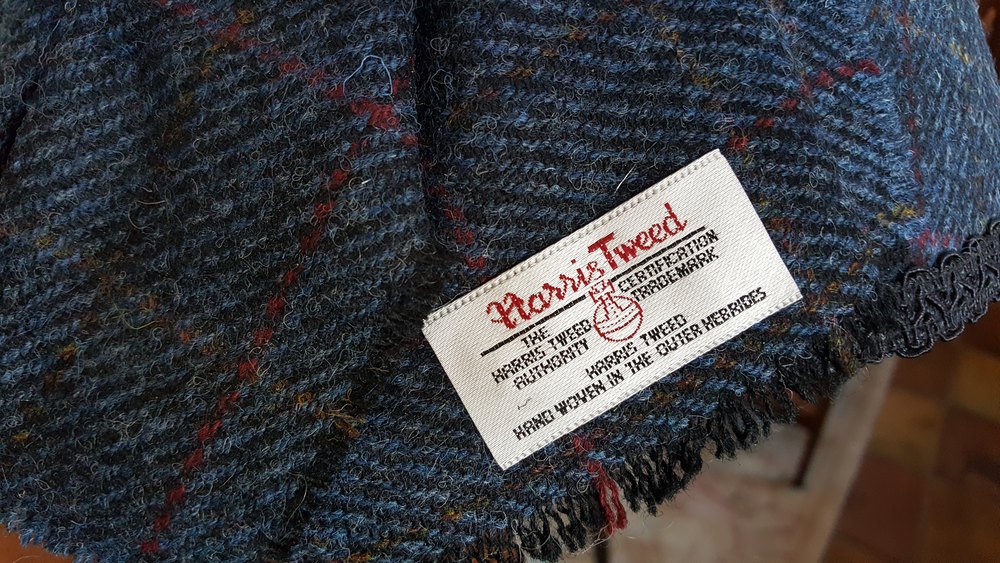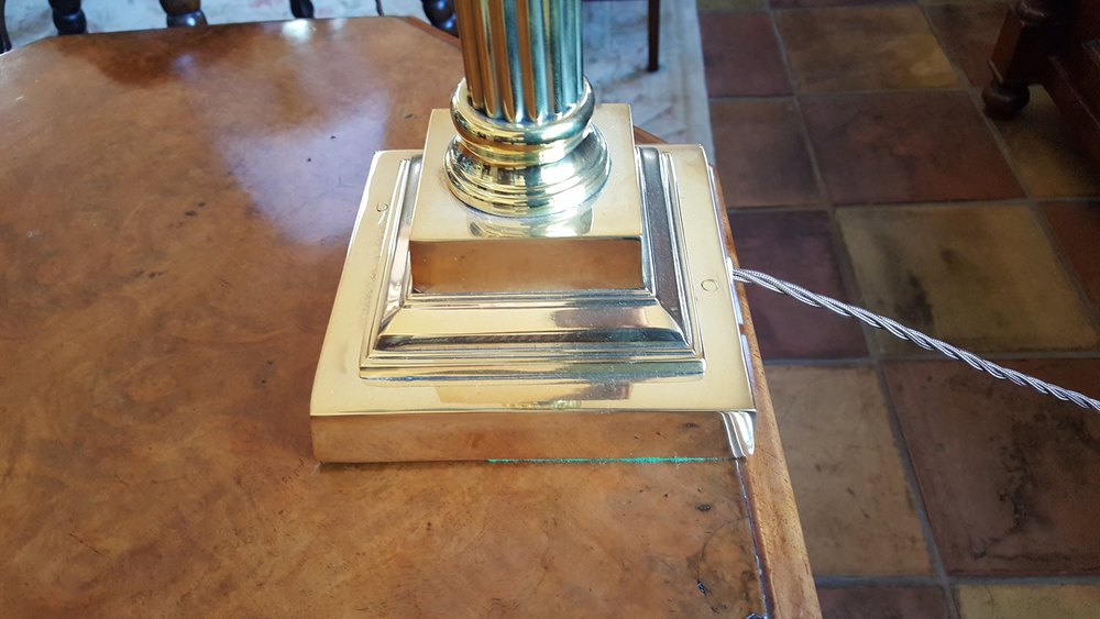 Pair of brass table lamps of neoclassical reeded Doric column form with Harris Tweed shades - 14"diam x 27"h - all lights and lamps have been rewired with authentic corded flex, fitted with either foot switch or finger clicker switcth and are Pat tested