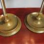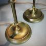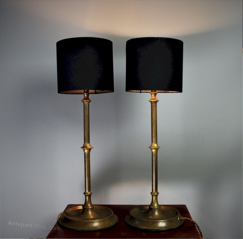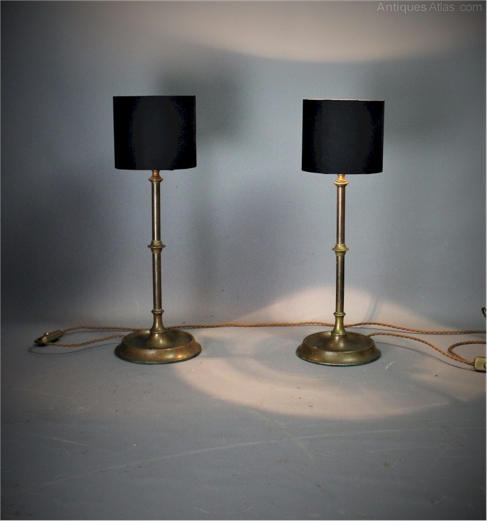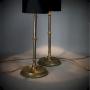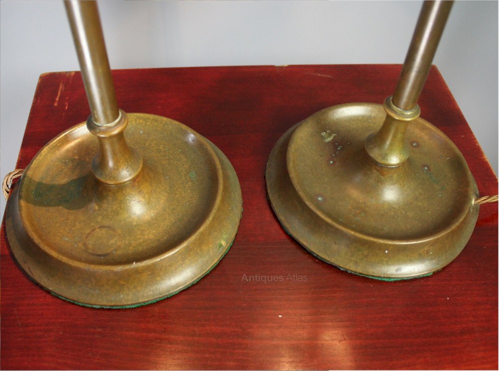 Pair of brass table lamps on circular bases. Lovely patina. Turned stems. Silk woven flex with chord switch Re-wired comes with PAT test Measures 40 cm high x 16.5 cm diam