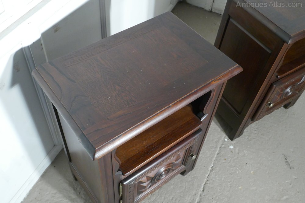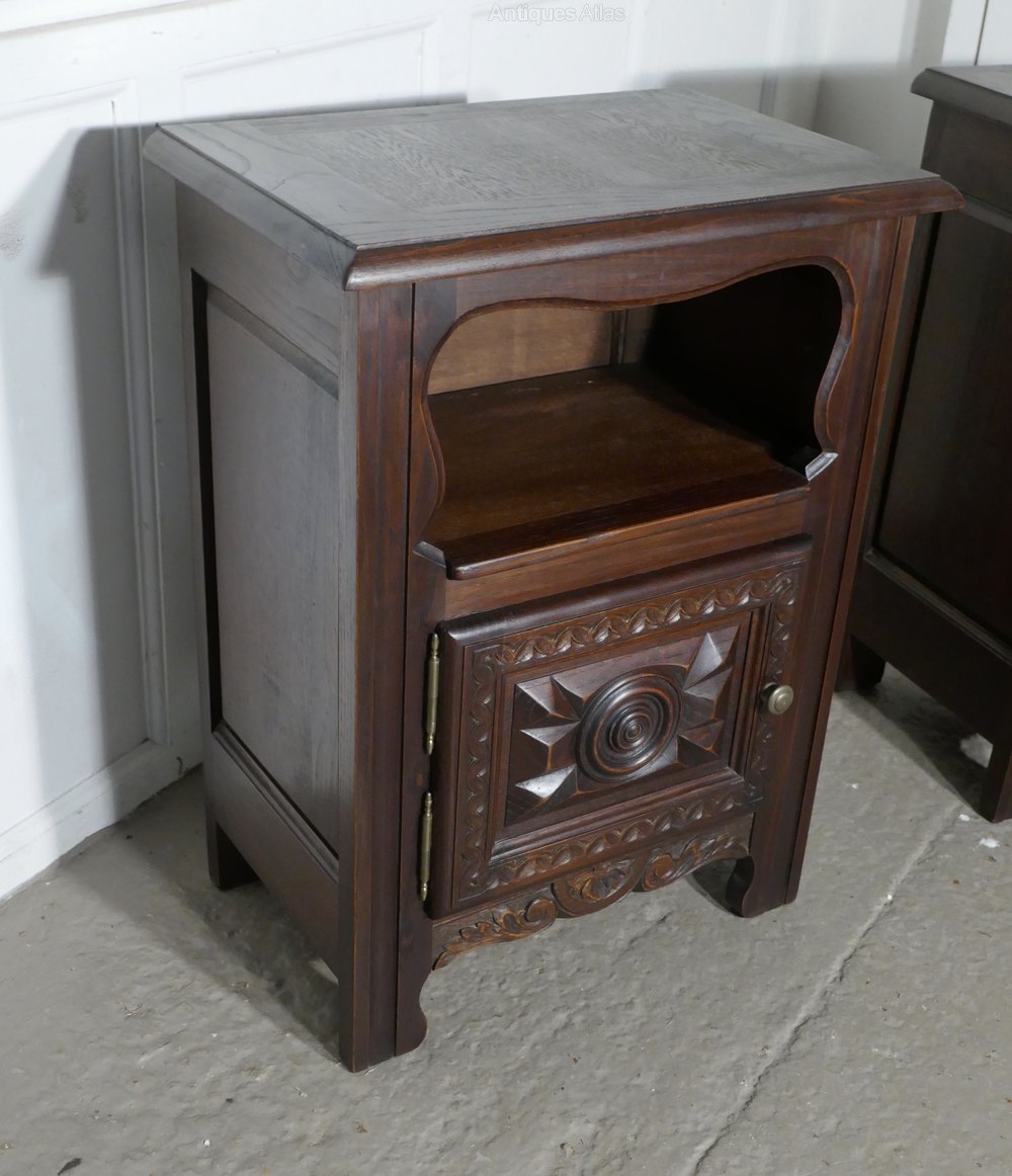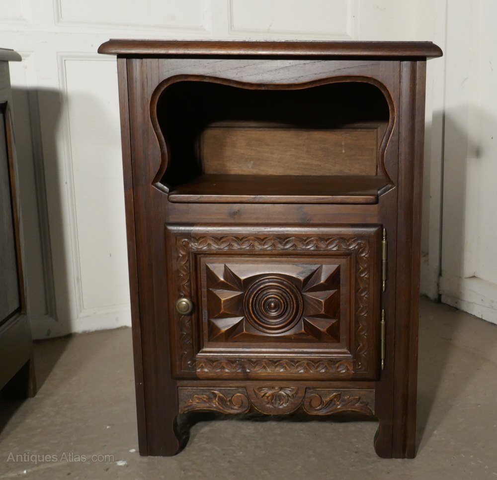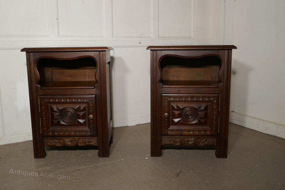 This is is a chunky pair of Breton style Oak bedside cabinets, at the top they have an open bookshelf, and a cupboard below The fronts of the doors have a Breton Wheel of life design