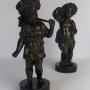 A charming pair of 19th-century bronze sculptures depicting cherubs harvesting wheat. Each figure is finely cast with expressive features and flowing hair, standing gracefully on marble circular bases. One cherub holds a sheaf of wheat over the shoulder, while the other hold a sickle, suggesting pastoral abundance and the allegory of the harvest.