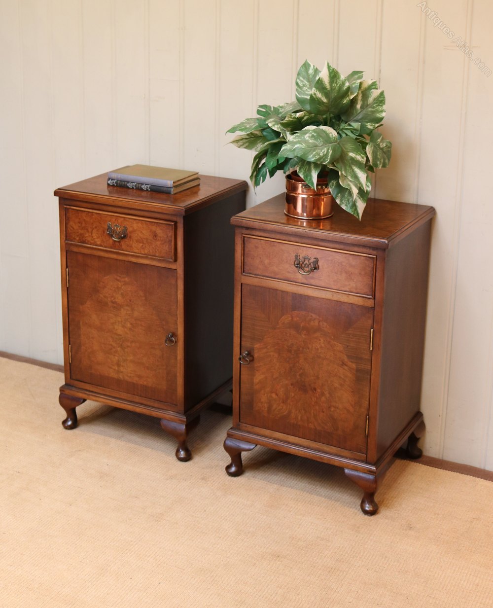 Pair of Burr Walnut bedside cabinets having a single drawer above a cupboard base with left and right handles raised on short cabriole legs