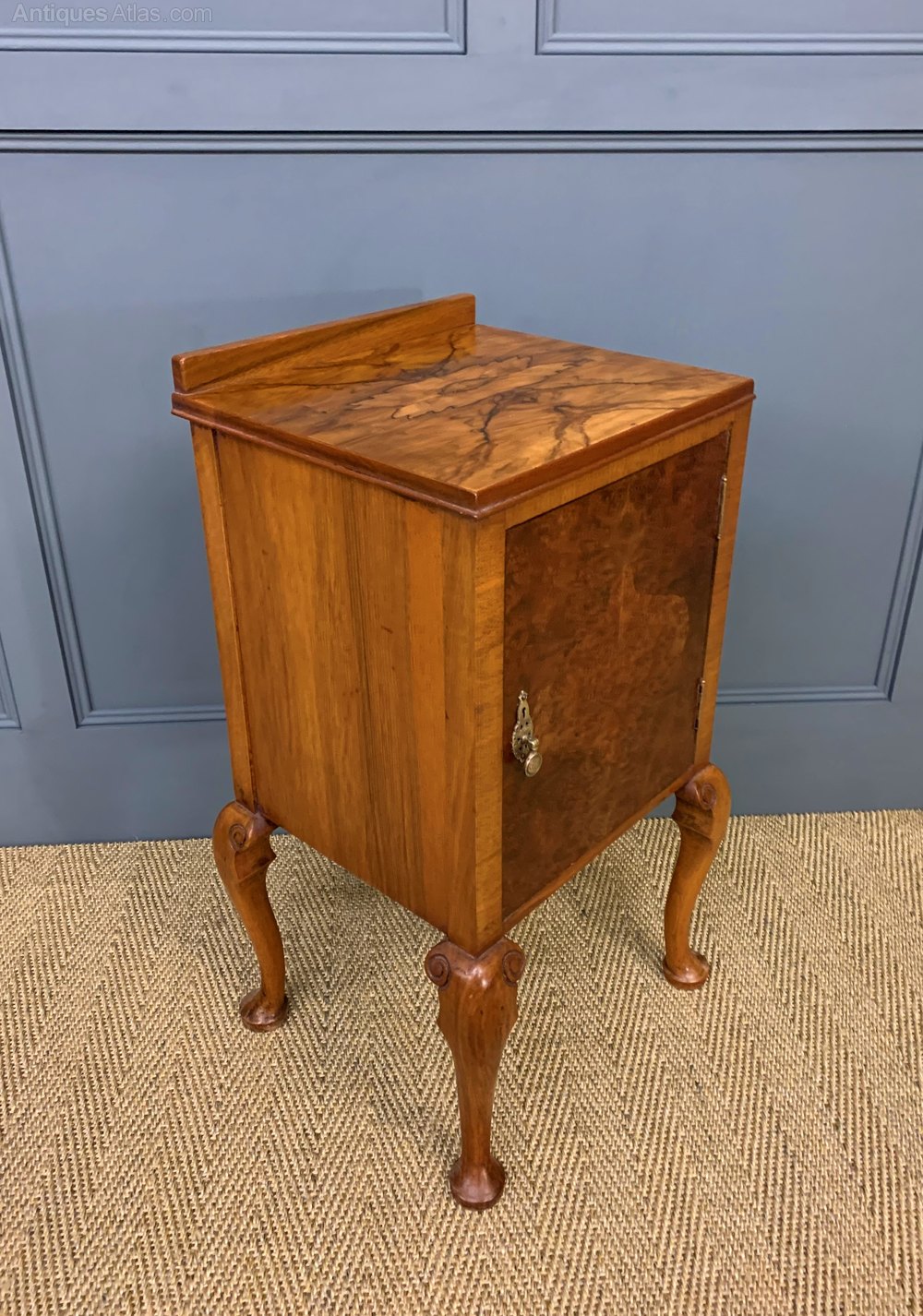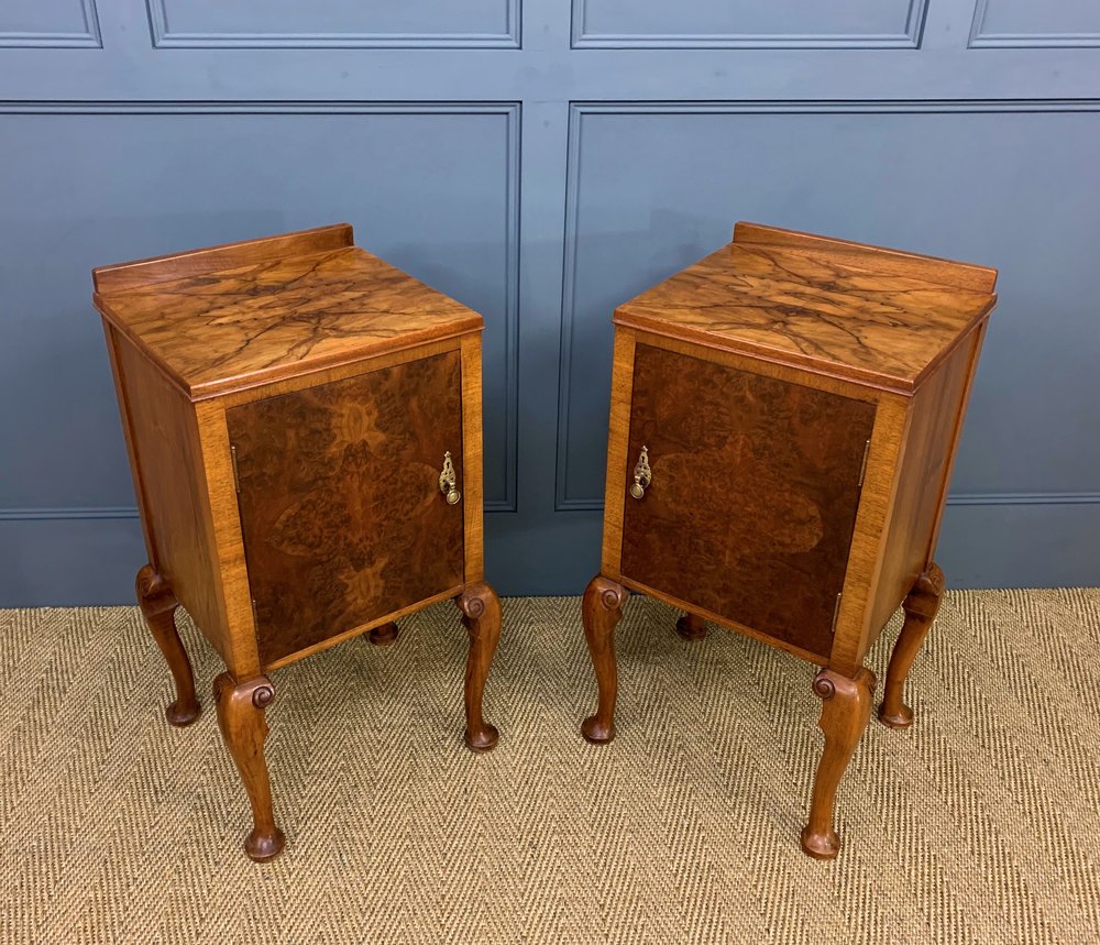 A lovely pair of queen Anne style burr walnut bedside cupboards. Very well made in walnut with attractive burr walnut veneers. Each with a single door , opening to reveal a shelved interior. Standing on elegant cabriole legs in solid walnut. We have had them sympathetically refinished in our workshops to a very high standard. Now offered for sale in excellent condition, with a great colour and patina, ready to go straight into the home.