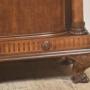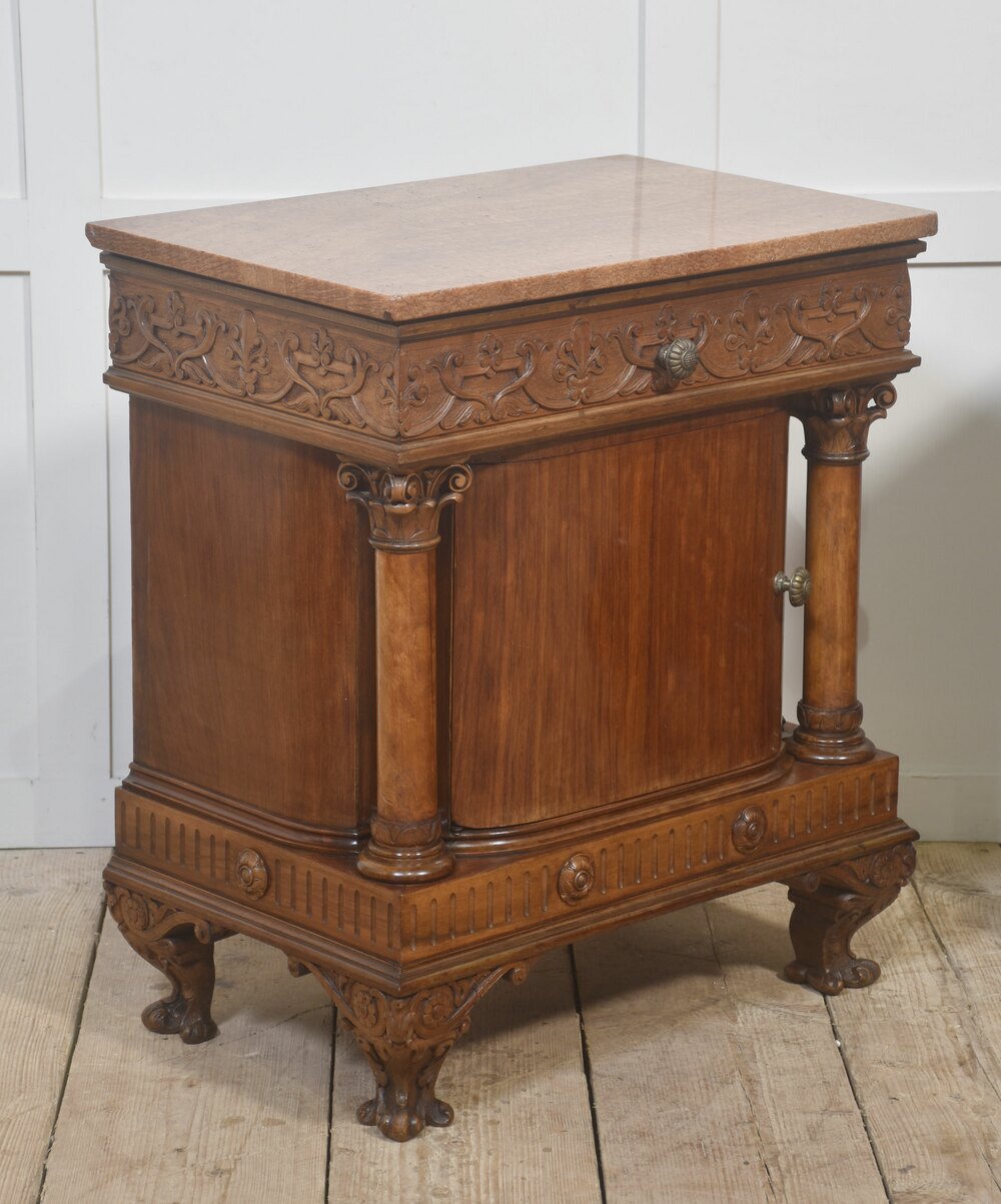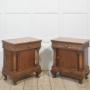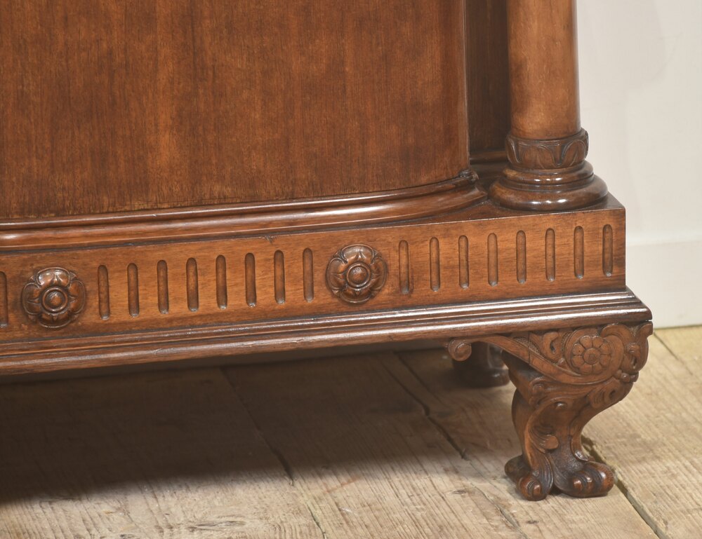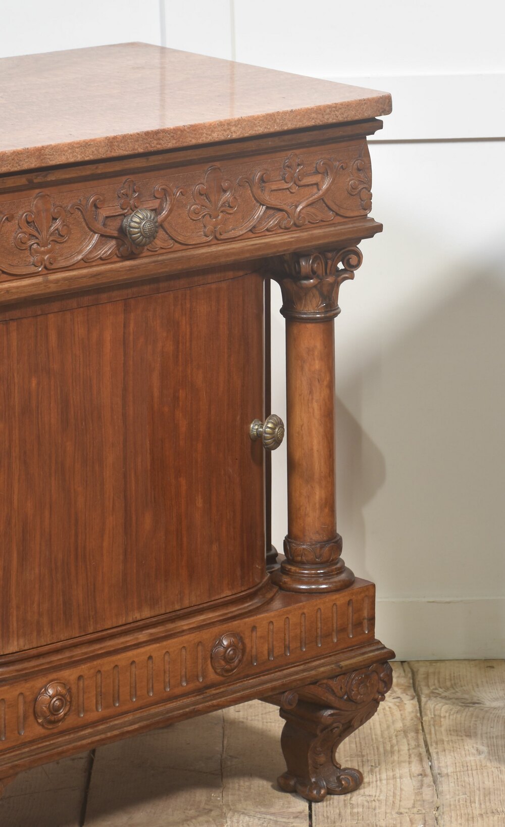 The cabinets are raised on a moulded and reeded plinth base, enriched with applied rosette motifs and standing on boldly carved, scrolled feet with floral detailing. The marble tops provide a durable and elegant surface, offering contrast to the warm mahogany below and making the cabinets suitable for lamps or decorative objects.