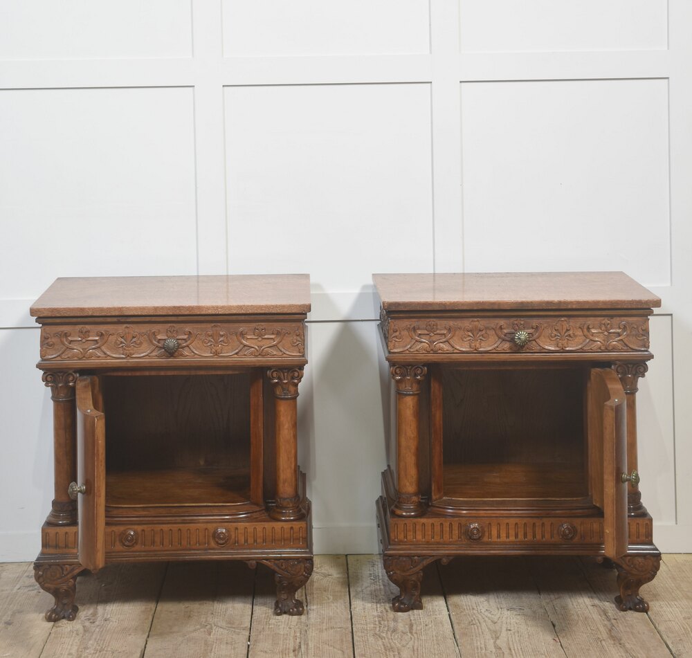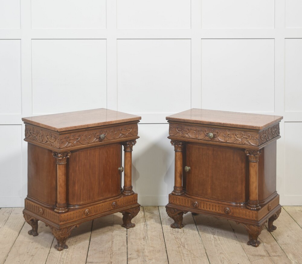 A refined pair of carved mahogany bedside cabinets, each surmounted by a rectangular marble top, and executed in a classical revival style. The cabinets display well-figured mahogany throughout, finished in a warm, polished tone that highlights the quality of the timber and the depth of the carving.
