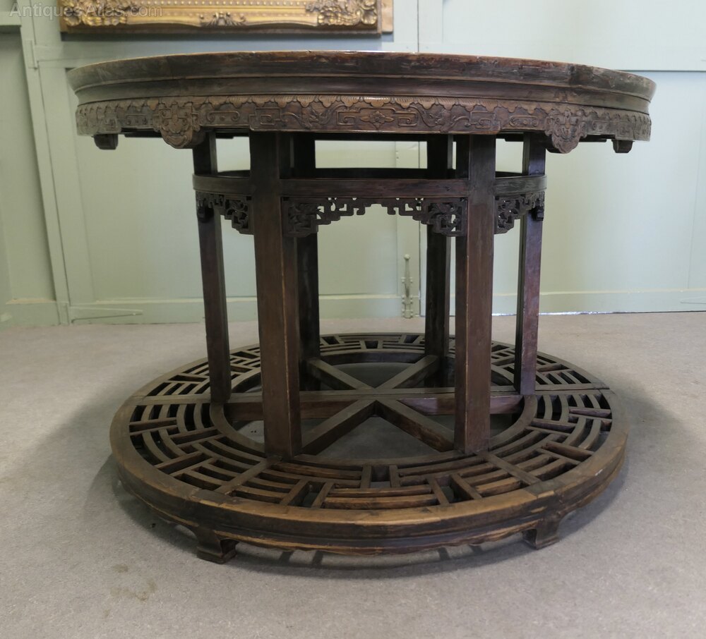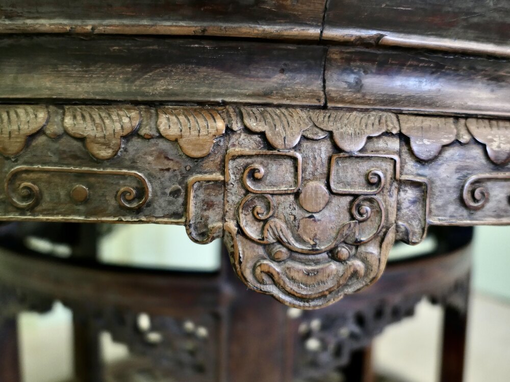 This is a 19th Century piece with a heavy quality frame, the apron below the table top is carved with mythical animals and patterns