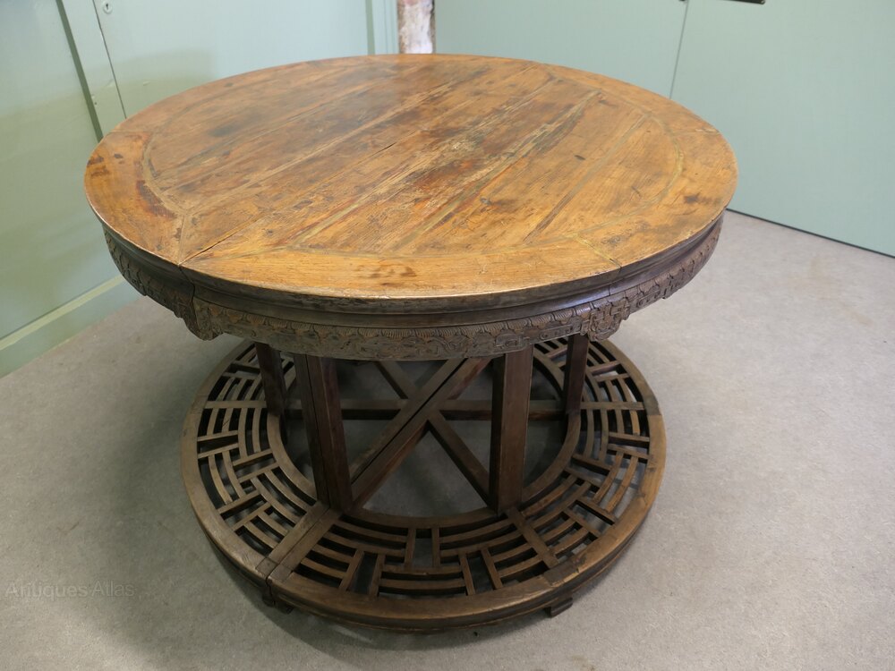 This is an unusual piece, we have a large rustic oriental centre table, this is a very heavy piece with carved under tiers and a wide foot rail, the table can be taken apart and then it forms 2 demi lune or console tables