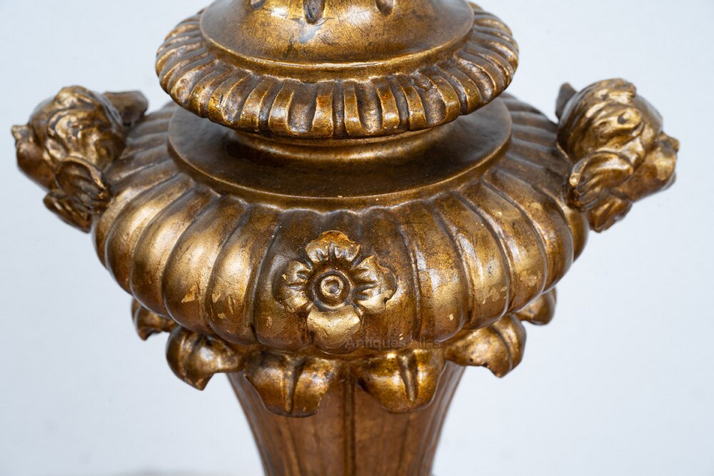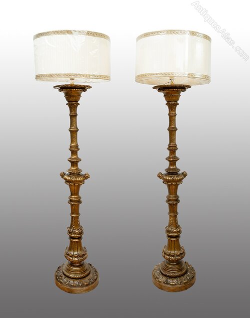 Description: A pair of antique floor lamps in gilded and carved wood, dating back to the first half of the 19th century.