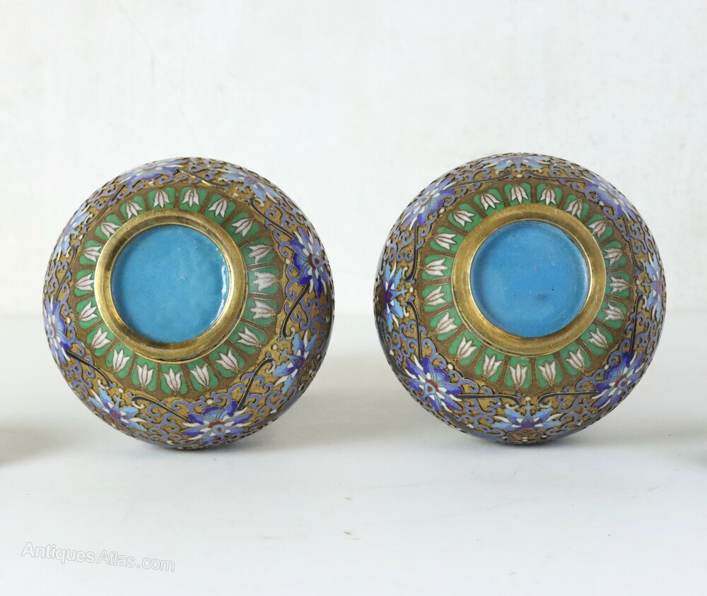 Champlevé is a technique in which the troughs are cast into the metal body and filled with vitreous enamel. It is distinguished from the technique of cloisonné enamel in which the troughs are created by soldering flat metal strips to the surface of the object. These vases are a particularly fine example of champlevé work.