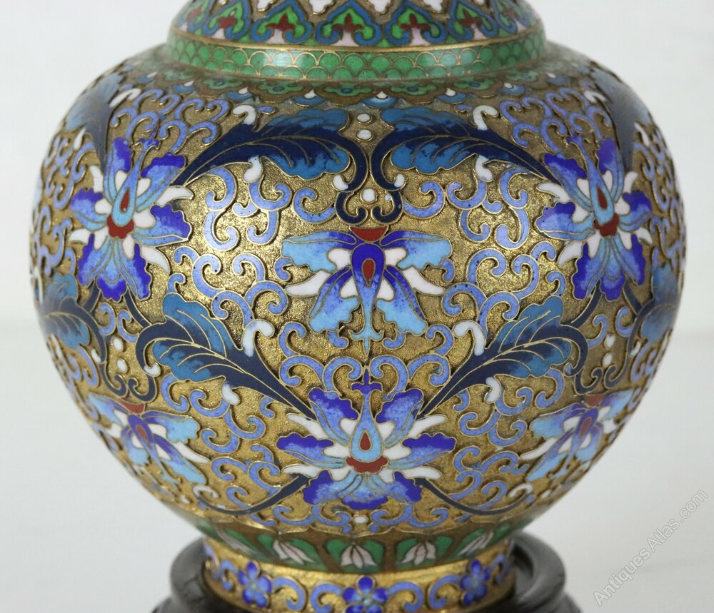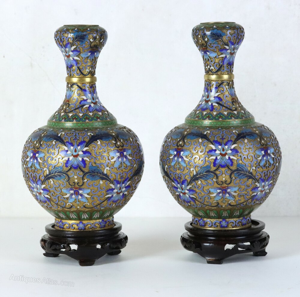 A fine pair of mid 20th century Chinese champlevé vases on footed wooden stands in perfect condition.