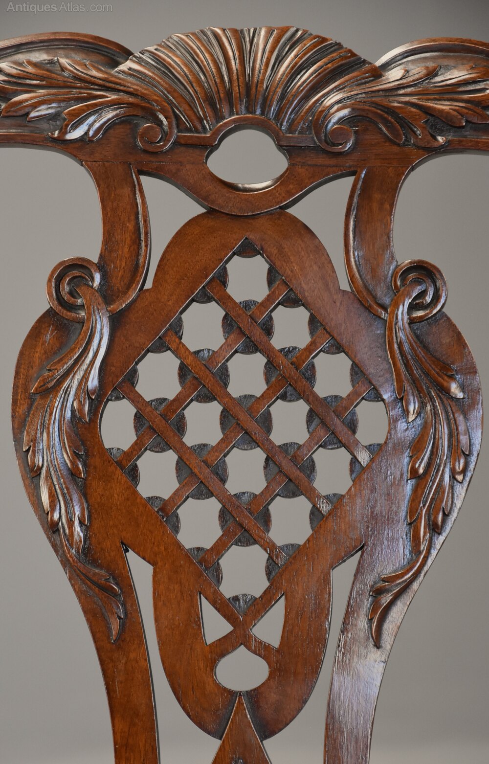 The unusual central splat with lattice design and foliate decoration with further foliate design below, the carved uprights consisting of floral and blind fret decoration and the shaped arms with carved foliate design.