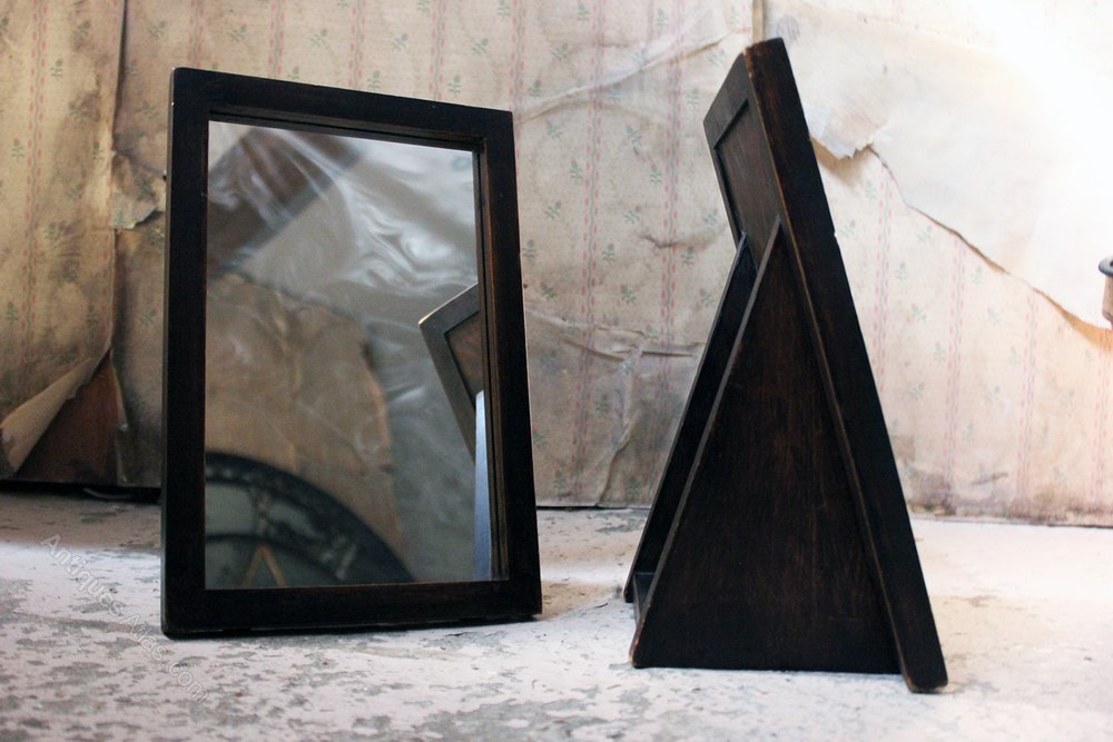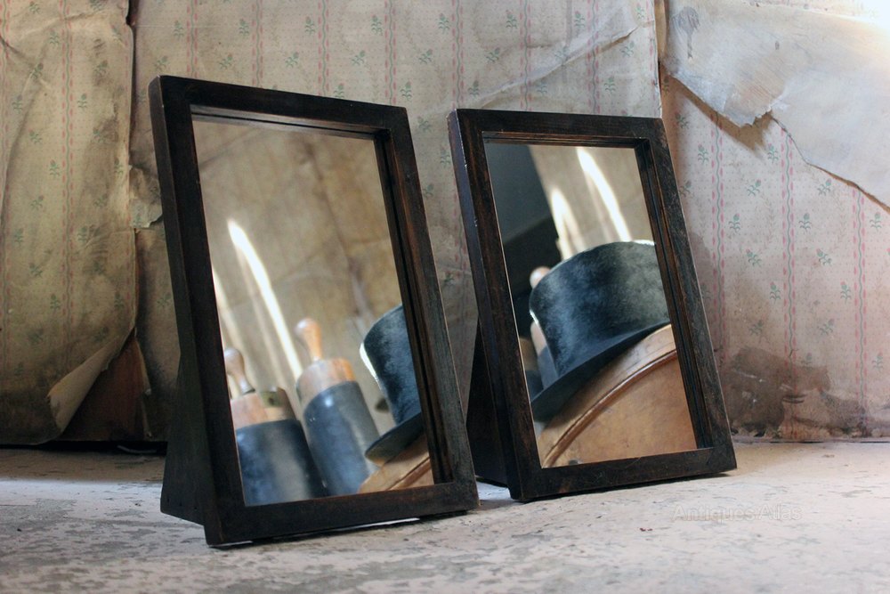 The pair of rectangular oak framed and easel backed table mirrors, to aid the selecting of an appropriate hat in a milliners shop, and hailing from the collection of items removed from the former milliners shop of Annie Gold, 42 Brushfield Street, Spitalfields, London.