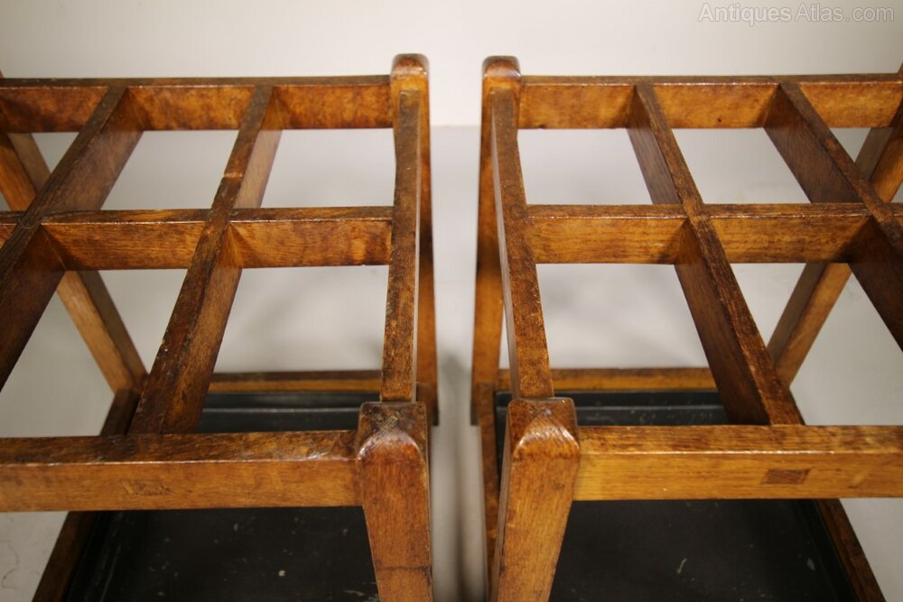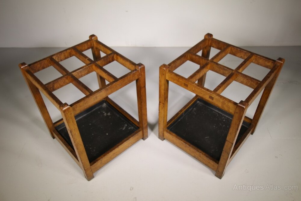 A good quality pair of English Edwardian antique solid oak square shaped stick stands, both are a very good colour and are complete with the original lift out tin drip trays. We have two pairs available. Perfect for pubs, hotel entrances and hunting / shooting lodges. They would make lovely side antique tables to with the addition of glass tops. They date to around 1900.
