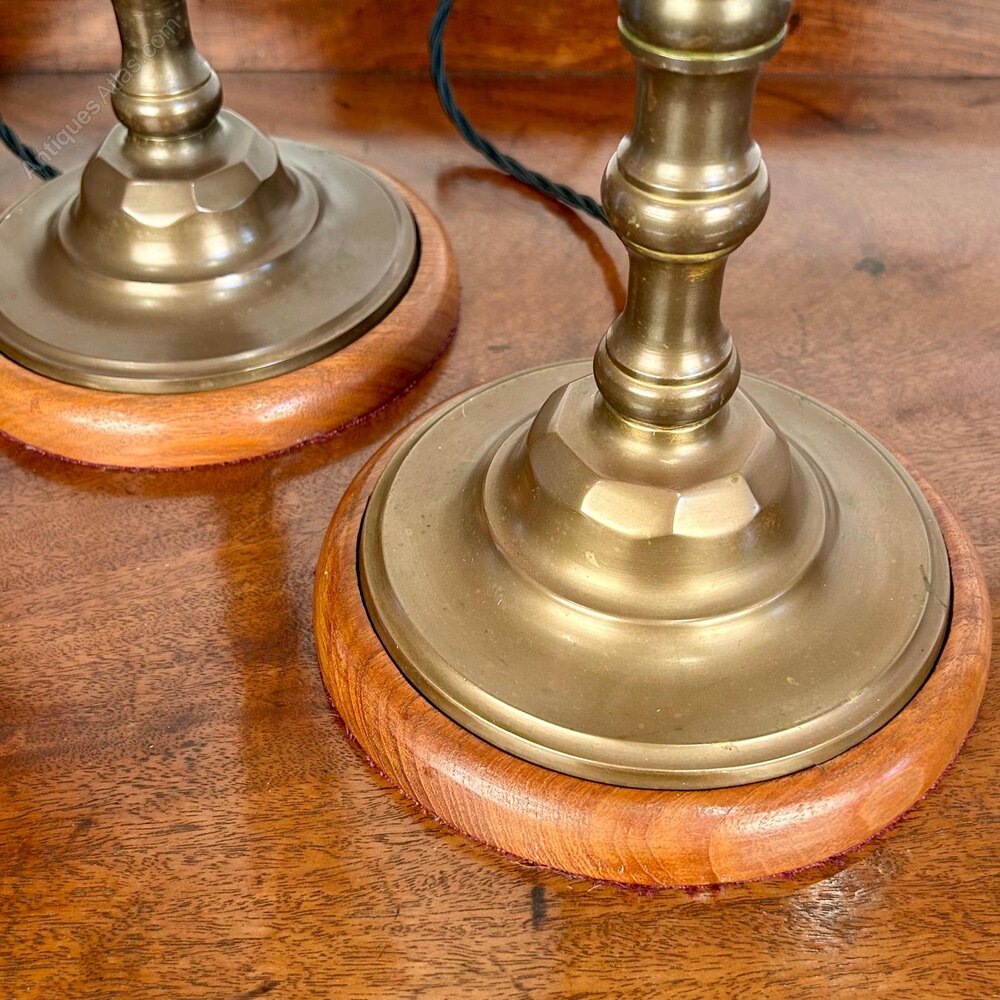 A true pair of Edwardian brass table lamps of good proportions and colour, mounted on walnut bases. Lovely original condition throughout. Re-wired and PAT tested, shades not included.