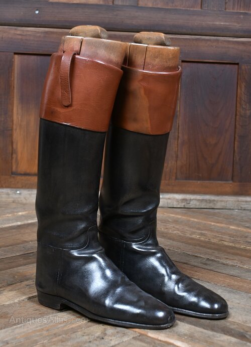 A superb pair of Edwardian riding boots in supple black leather topped with a contrasting brown leather cuff approx. size 10 in wonderful antique condition. The boots retain their original wooden boot trees, carefully shaped to preserve their form. The rounded toes, stacked heels, and gently contoured shafts speak to both function and style, designed for comfort and durability in the saddle. Whether displayed as a decorative accent or appreciated for their historical significance, these boots offer a compelling glimpse into Edwardian craftsmanship and equestrian culture. A fine addition to any collection of period attire or sporting antiques.