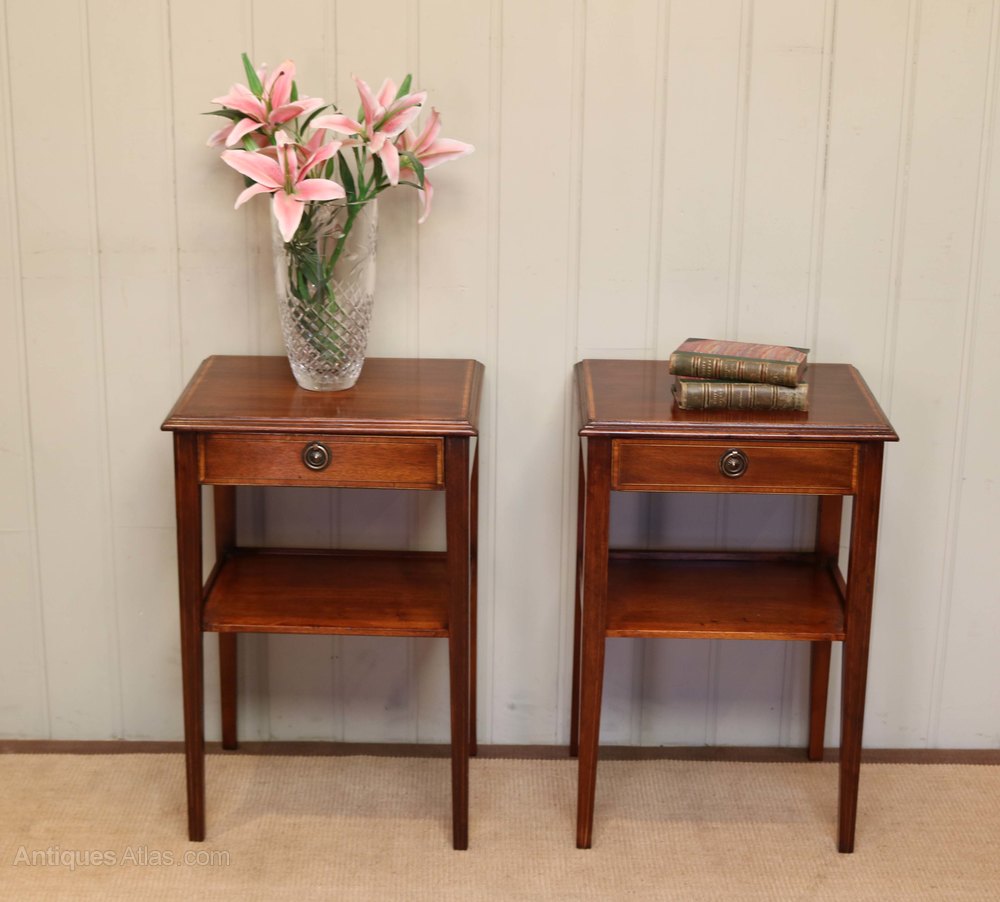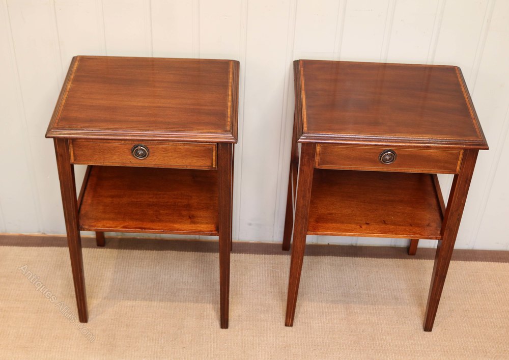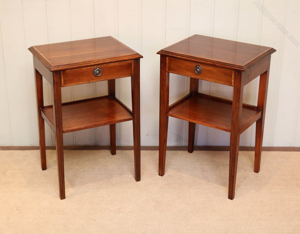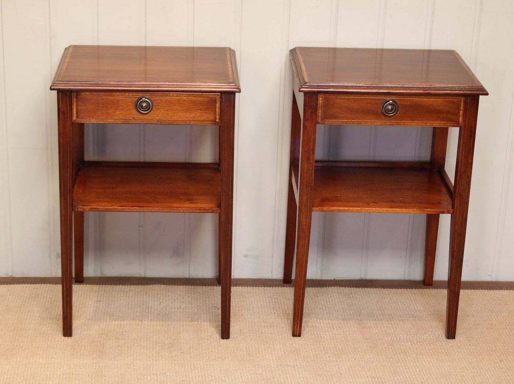 Pair of inlaid mahogany antique tables having two tiers with a single drawer to the top raised on square tapering legs with satinwood crossbanding