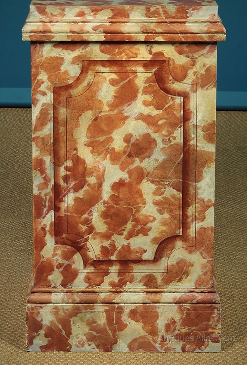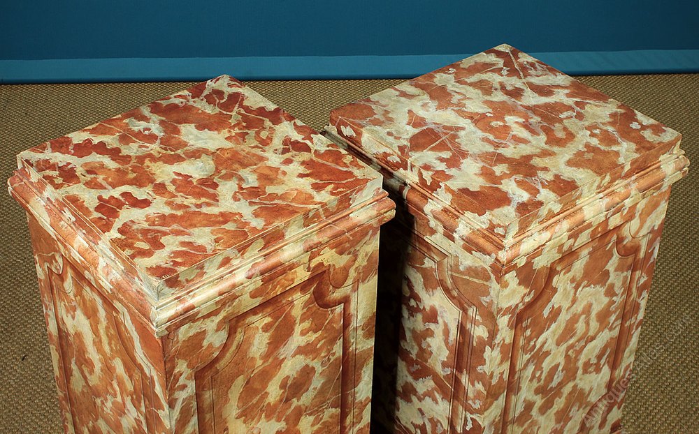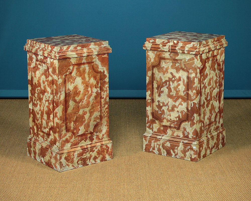 Superb pair of faux marble plinth pedestals. Sturdily constructed wooden pedestals, 33″ tall with 15½” square tops, suitable for heavy pieces of sculpture etc. Cleverly painted to the top and all four sides to look like marble, with trompe l’oeil shaped panels on the sides. Moulded detail around the tops and bases. Very good condition with only very minor wear to the tops.