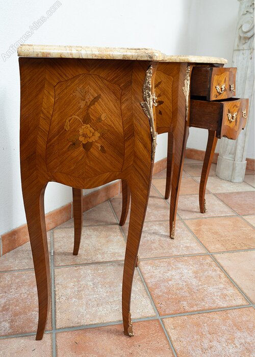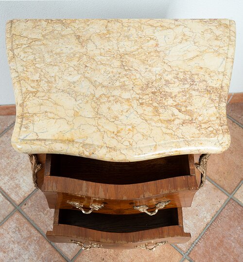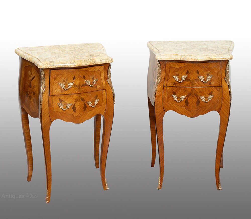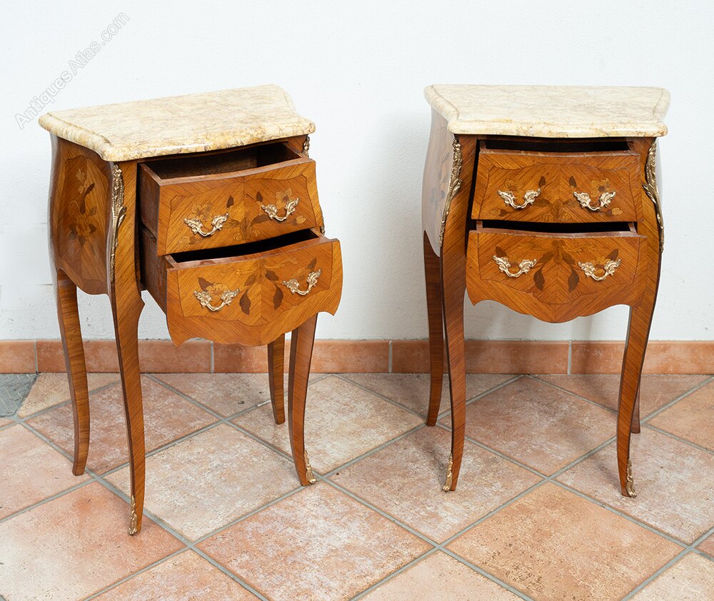 Description: Pair of Napoleon III-style bedside tables made of fine exotic woods from the early 20th century.