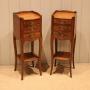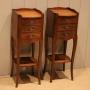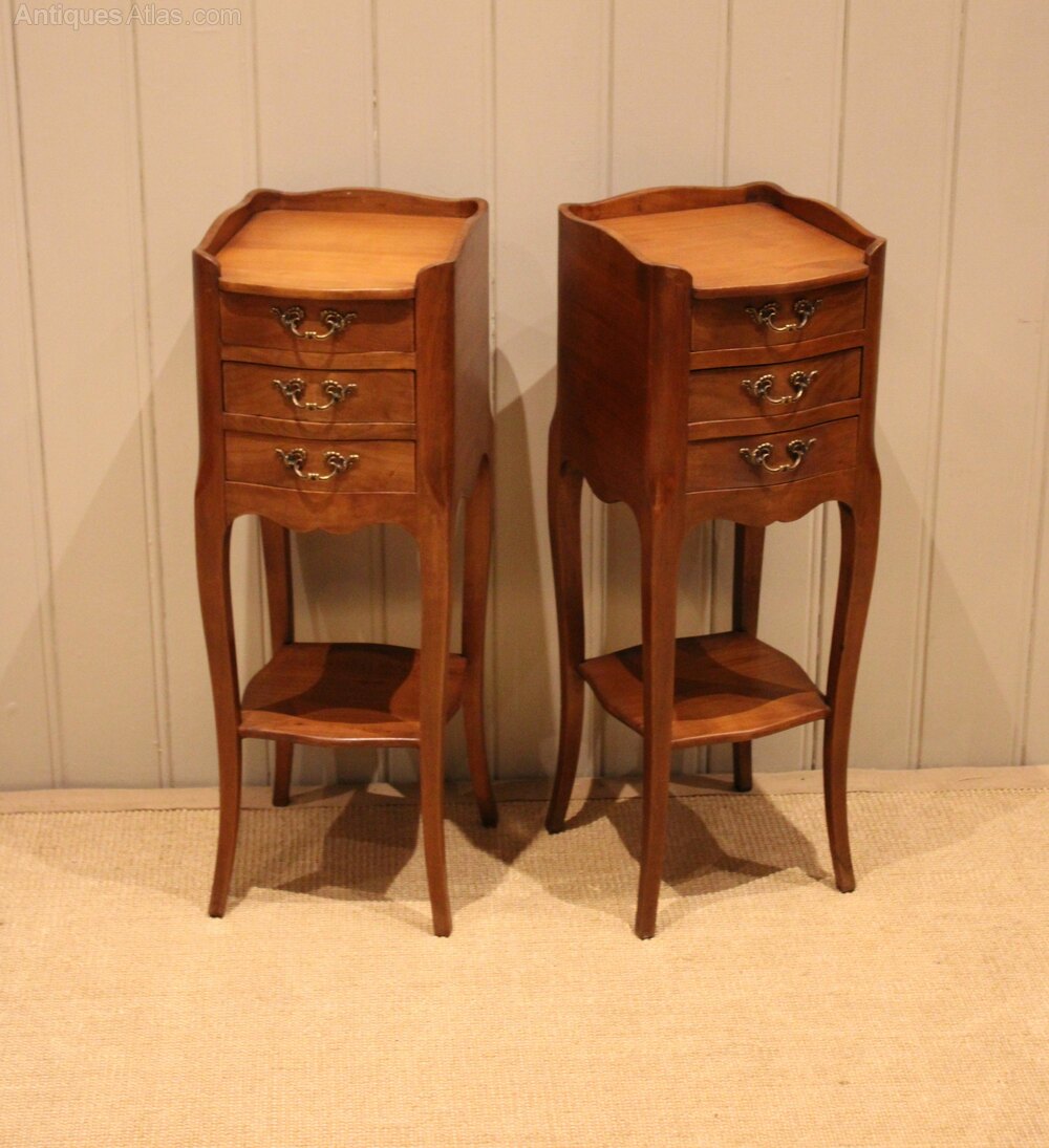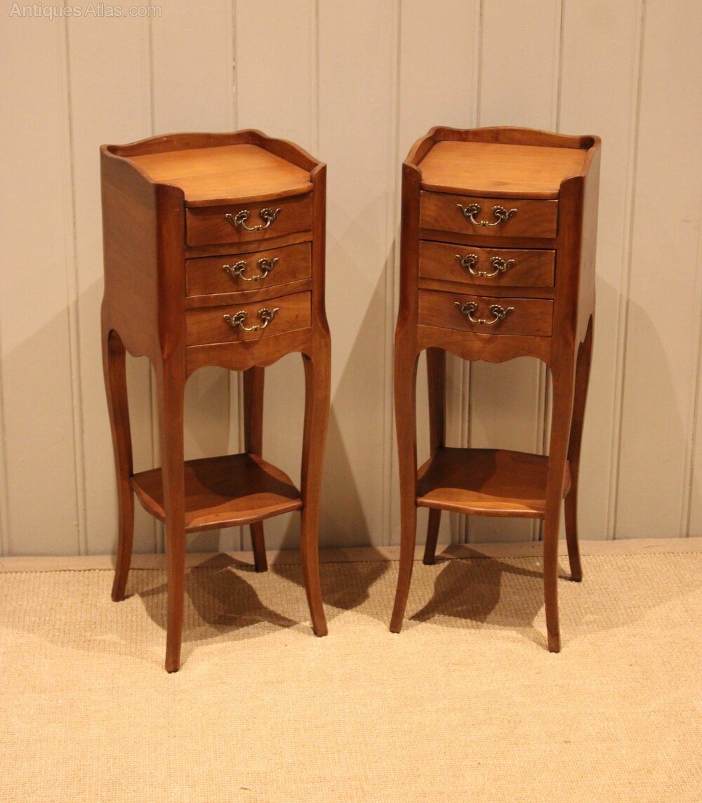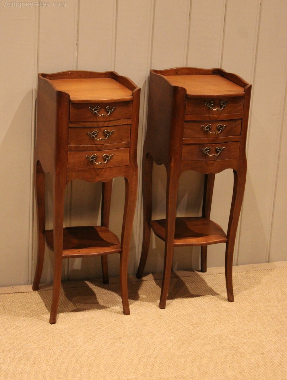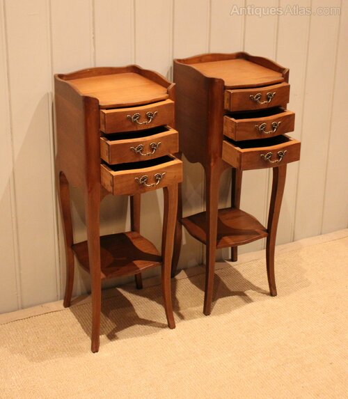 Pair of French cherry wood small proportioned bedside cabinets having three drawers , with an undertier ,raised on outsplayed legs .
