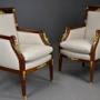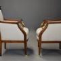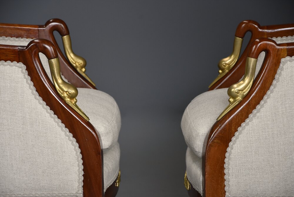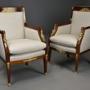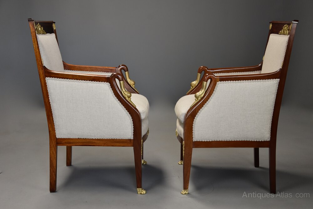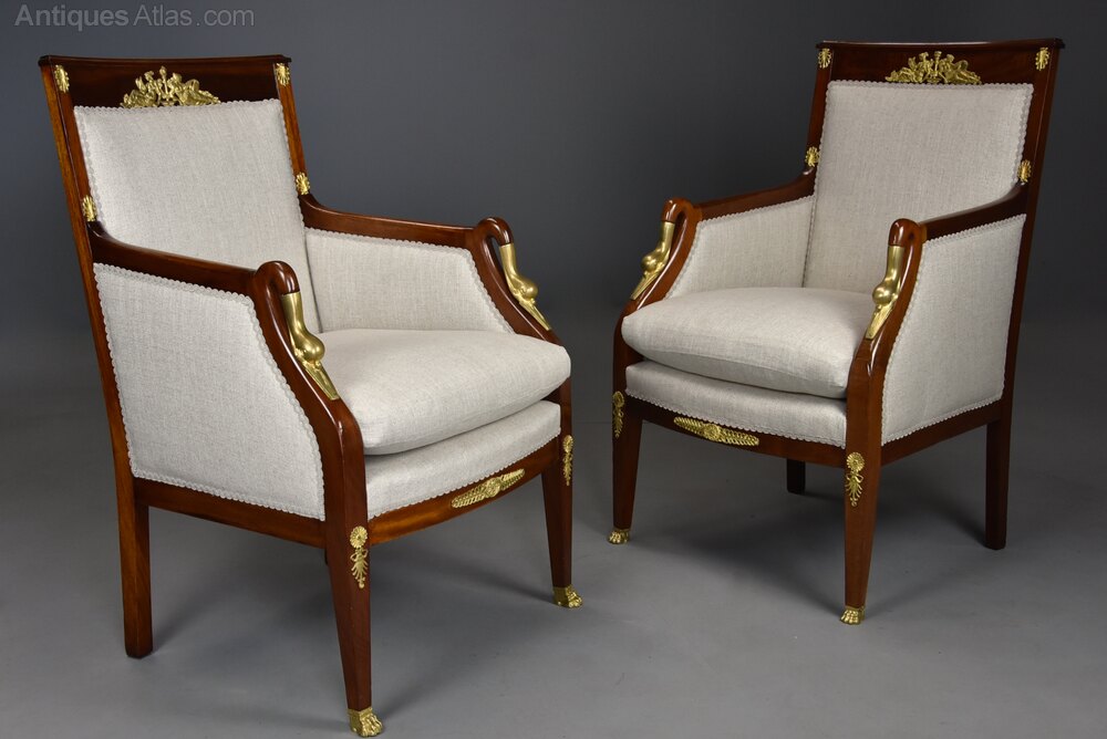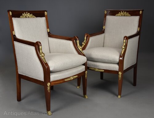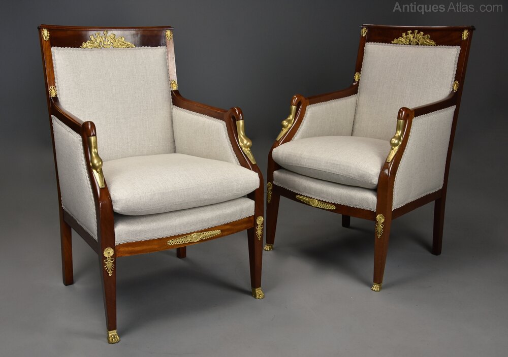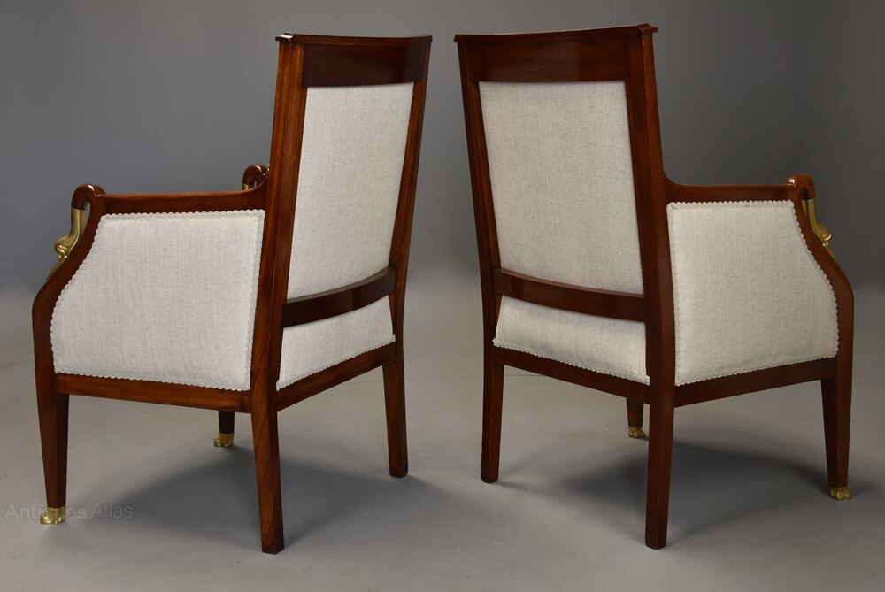 This pair of armchairs are of ‘Empire’ style, the French Empire period was between 1800 - 1815, the furniture tending to be of larger proportions and with many decorative embellishments. The influences at this time particularly taken from ancient Rome and the Neoclassical styles.