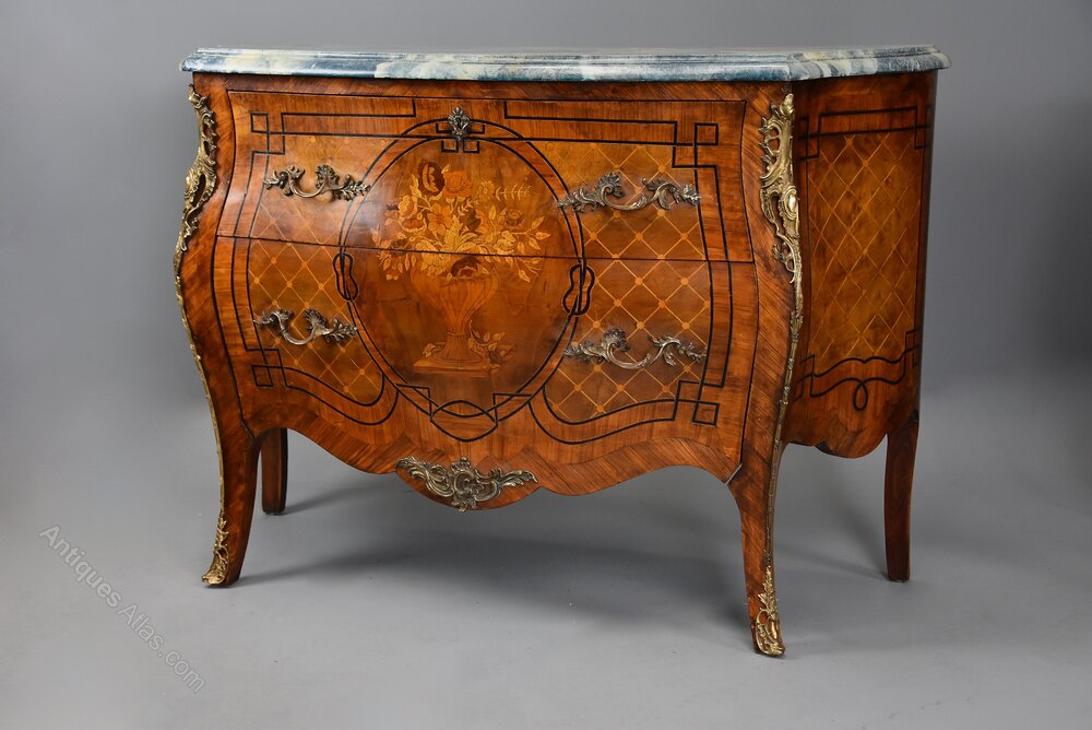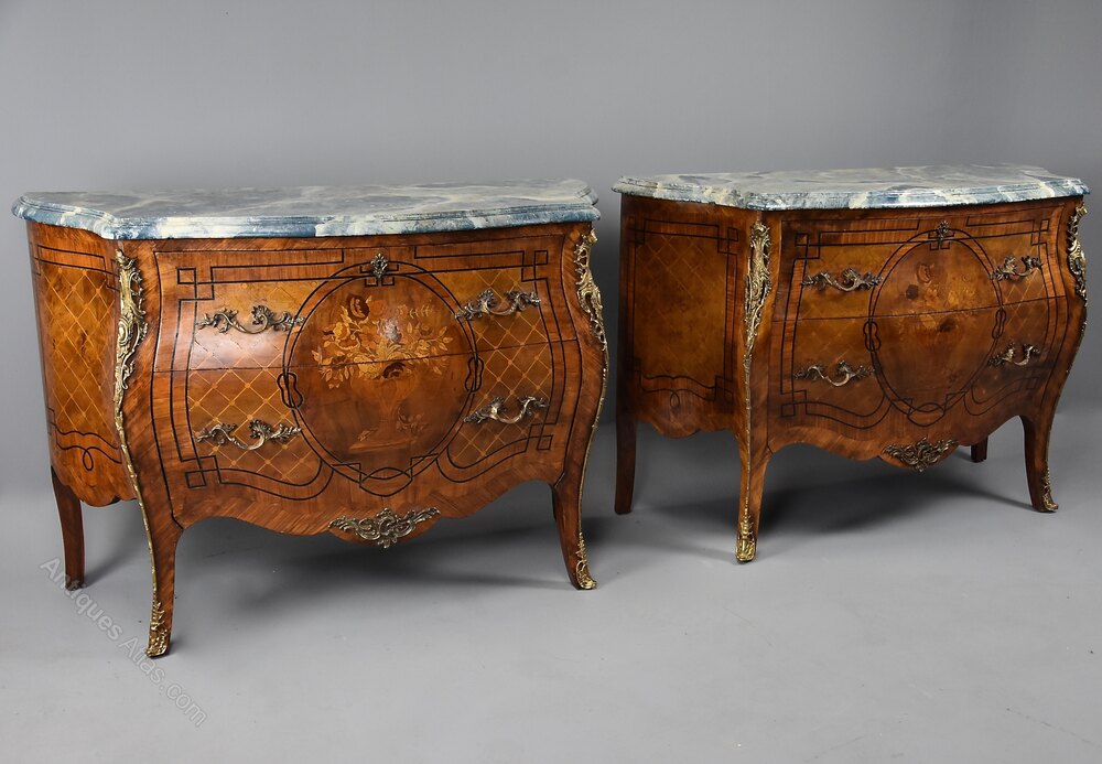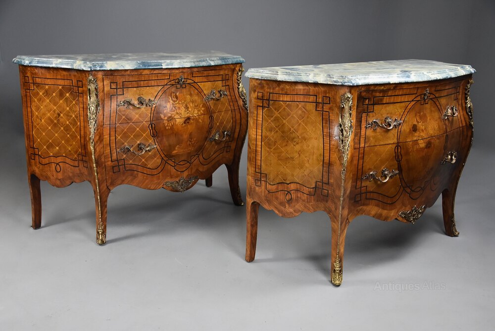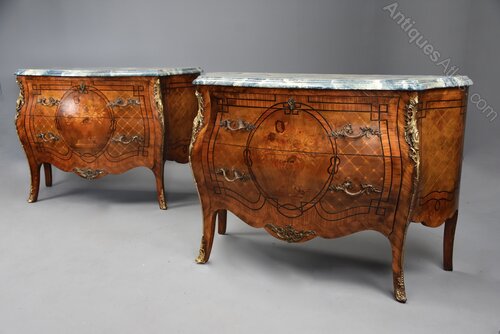 A pair of highly decorative early 20th century (circa 1910) French Kingwood bombe commodes.