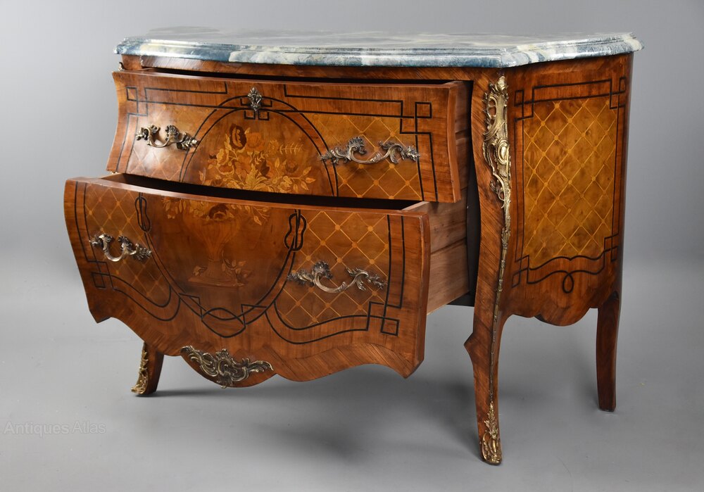 The drawers each with gilt metal Rococo style handles, escutcheon to the top drawer, foliate central mount to the lower drawer with shaped apron below of tulip crossbanding.