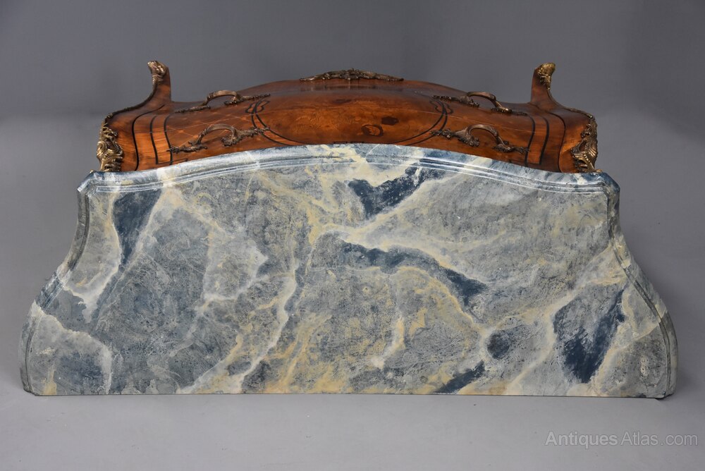 The corners having gilt metal Rococo style mounts to the top with further mounts running down the legs terminating with a mount to the front feet.