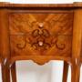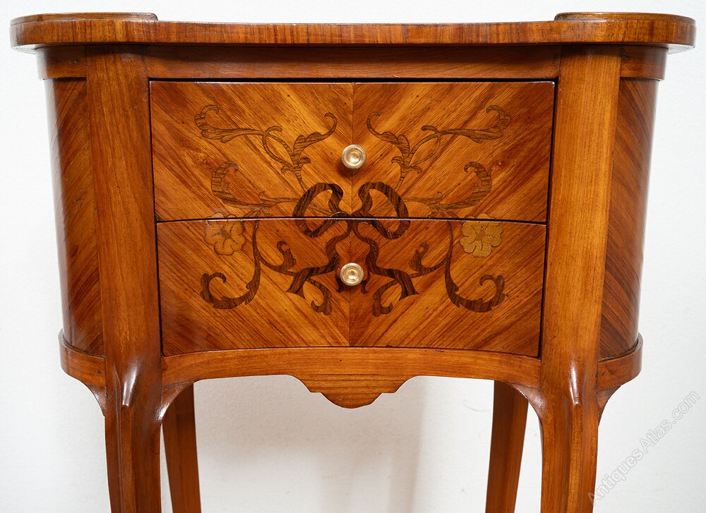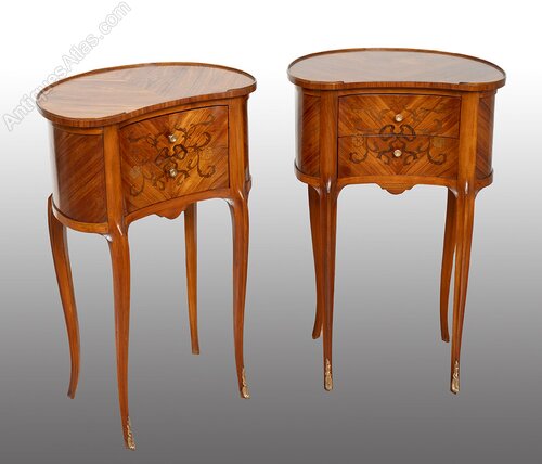 Description: A pair of antique French Napoleon III-style bean-shaped bedside tables made of fine exotic woods, dating back to the early 20th century.