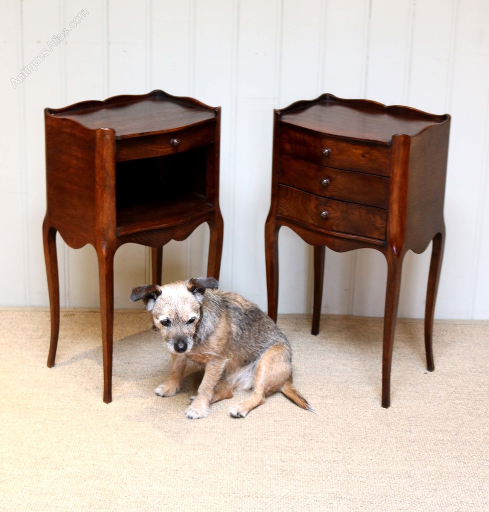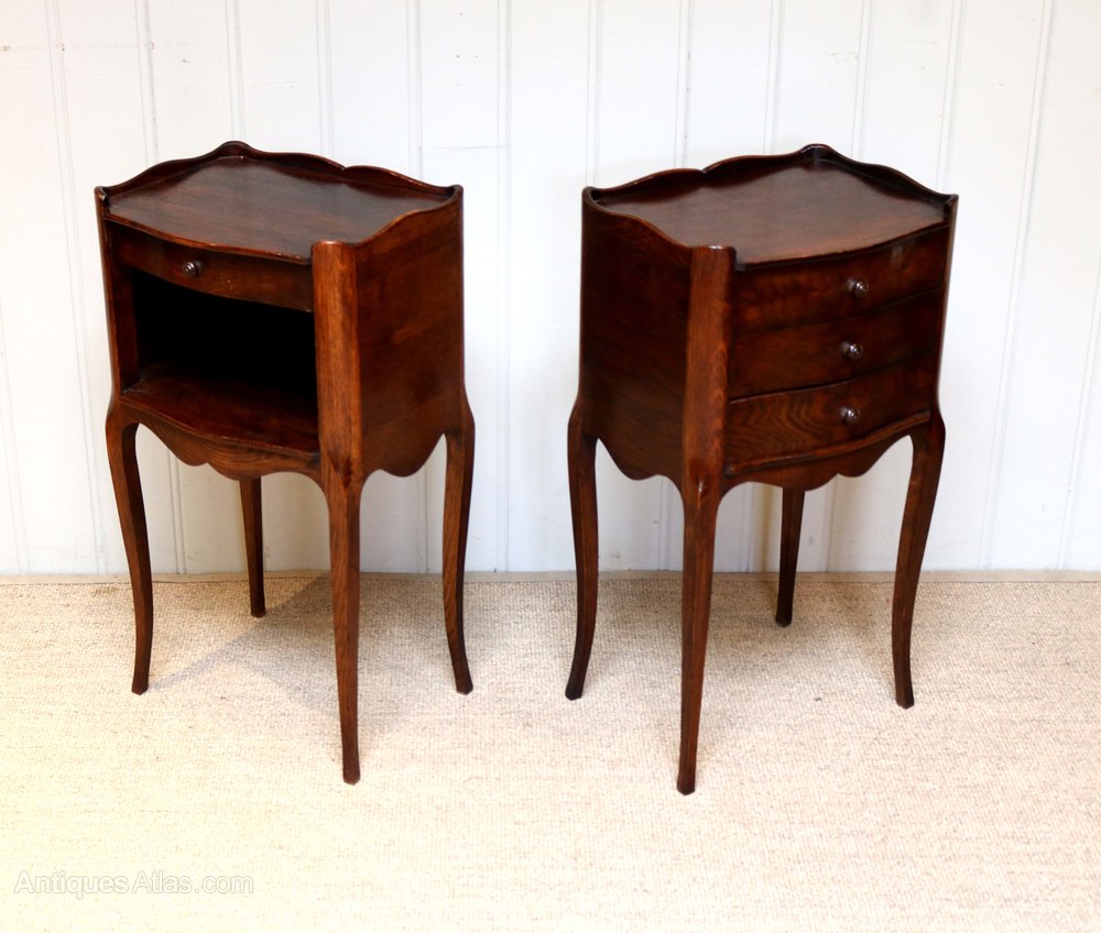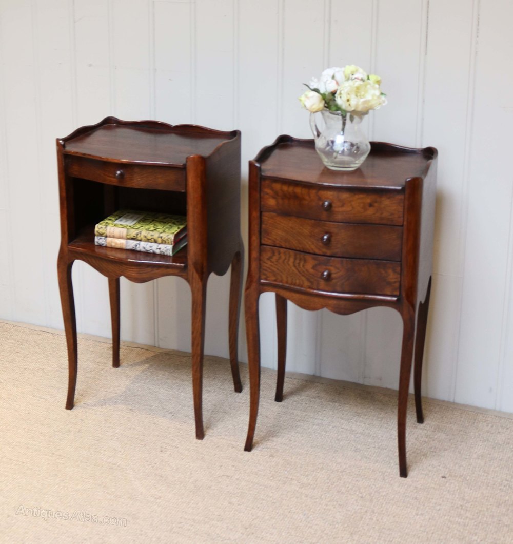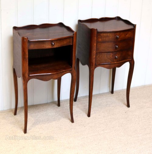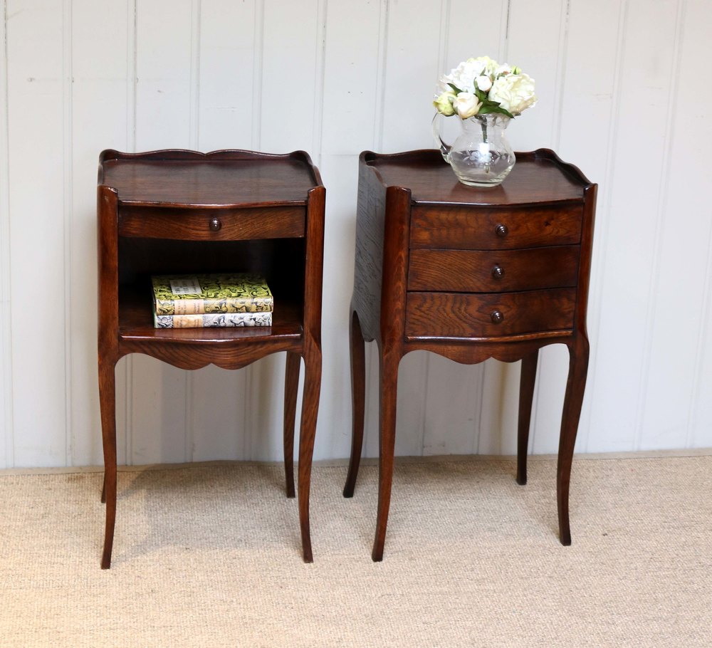 Pair of French oak bedside cabinets one having three drawers the other with a single drawer above an open cupboard base raised on cabriole legs
