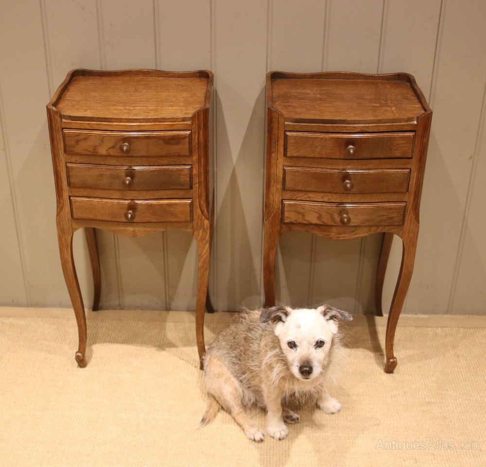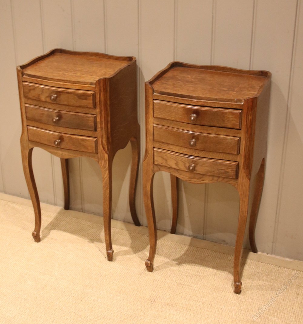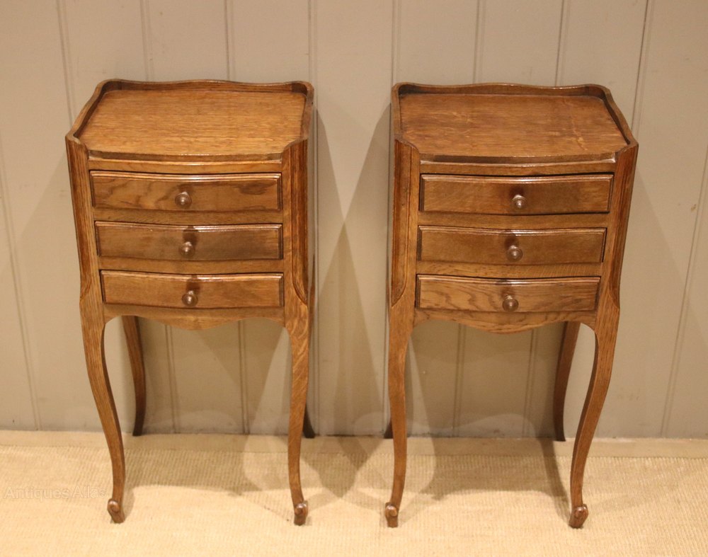 Pair of French oak bedside cabinets having a shaped top with three drawers, raised on cabriole legs